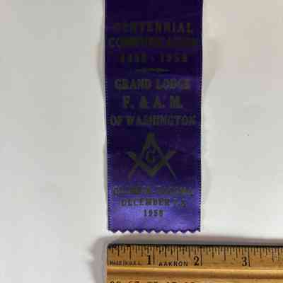 Ribbon: Purple with brown lettering. "Centennial Communication 1858-1958/Grand Lodge F.&A.M. of Washington/Olympia-Tacoma, December 7-8, 1958"Dimensions