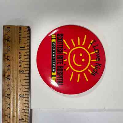 Button: Red with yellow and black print. Sun and crayon. "I Love Kids/Texas Scottish Rite Hospital For Children" (c. 1995)Collection