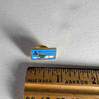 Pin: Blue and gold. Shriner. Temple with trees in the background, and square and compass. "Bellingham Temple" Donated by PGM James O. Wood (c.1999)Collection