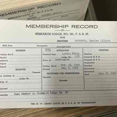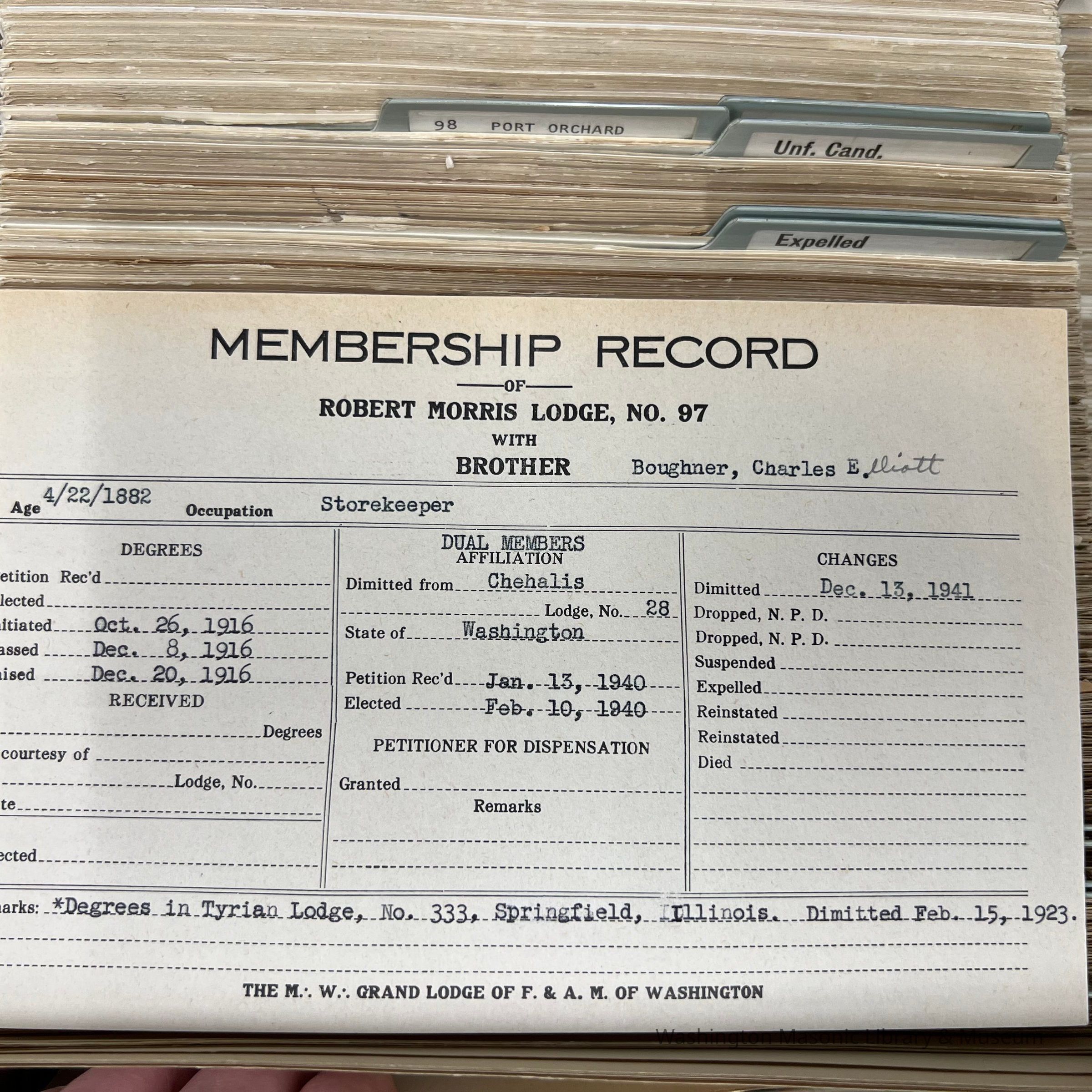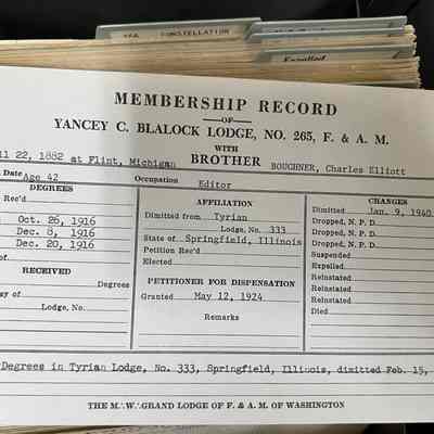 Associated with 2019-A70-01, apron belonging to Charles E. Boughner. Apron is from Tyrian Lodge 333, Springfield IL, where he was raised in 1916. Boughner later moved to Washington and joined Yancey Blalock Lodge 265.Collection