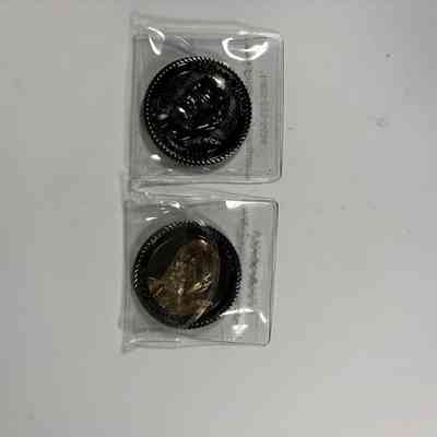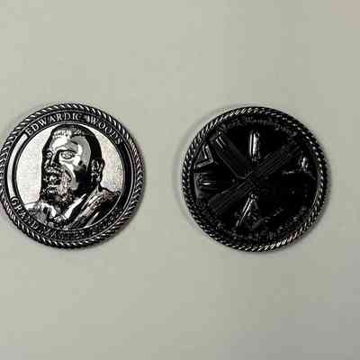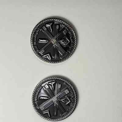 2 Coins: Two Past Grand Master Coins, MW Ed Woods (2022-2023). Depicts Woods bust on the front side, and a puzzle that can be decoded by Masons on the back.
