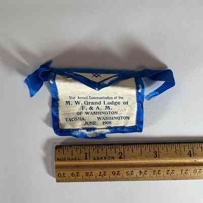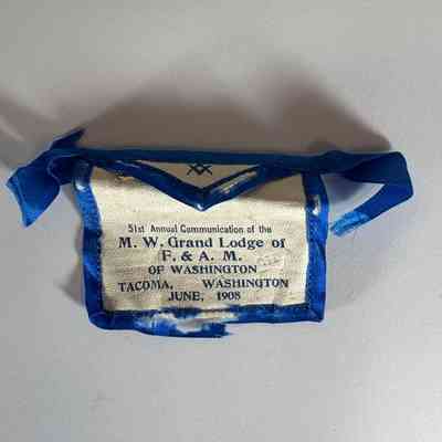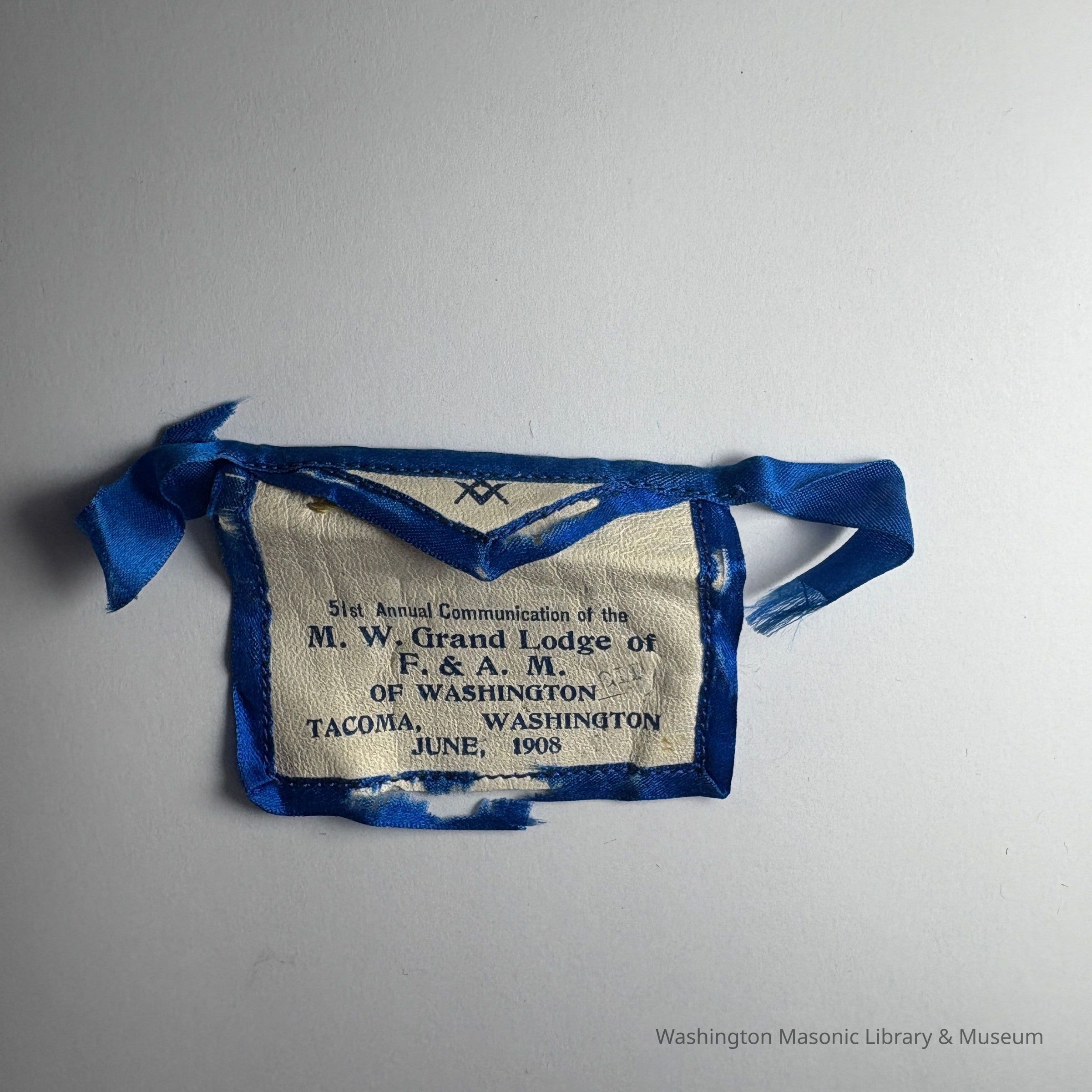 Ribbon: White with blue trim. In the shape of a Masonic Apron. "51st Annual Communication/ M.W. Grand Lodge F.&A.M. of Washington/ Tacoma, Washington/ June, 1908"Collection