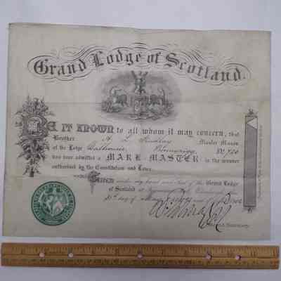 Certificate: Mark Master Certificate for A.L. Findlay of Dolhousie Lodge No. 720 (Bonnyrigg, Scotland) (1902)