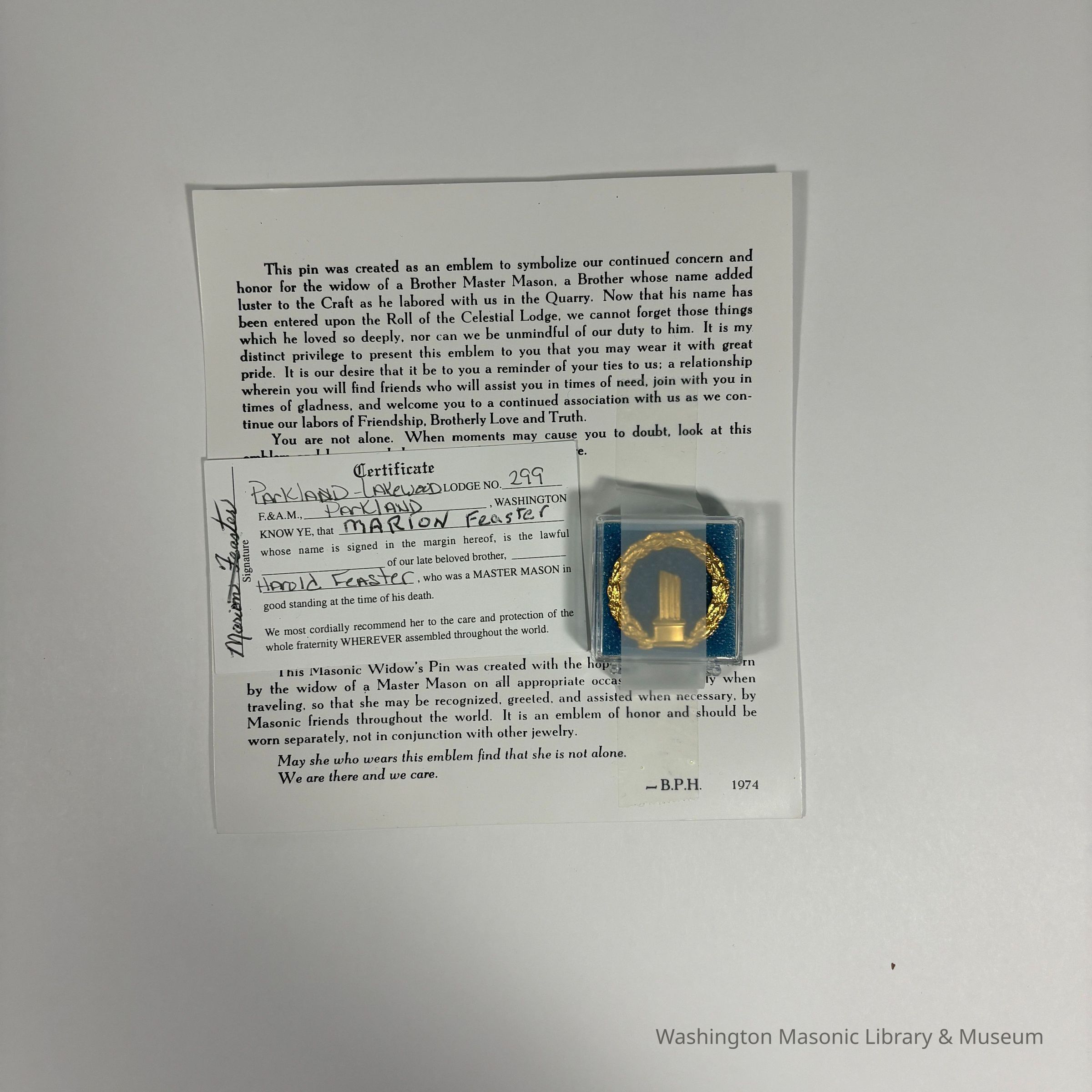 Pin: Widow's Pin. Issued by the MW Grand Lodge of Washington to Marion Feaster (2021)Dimensions