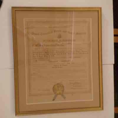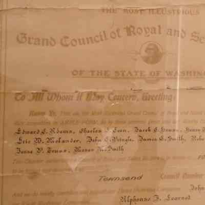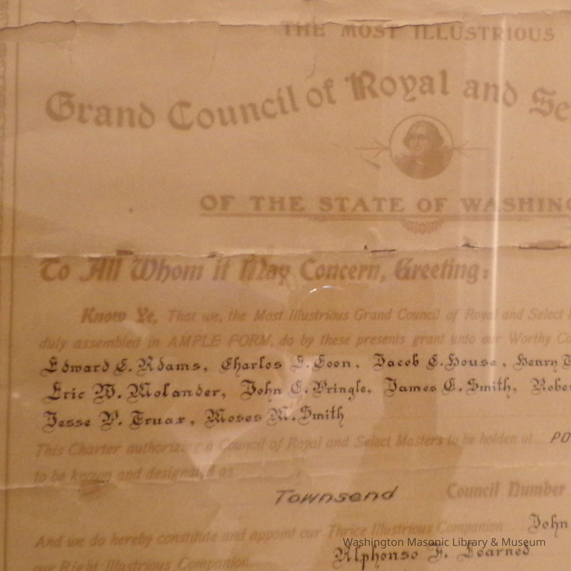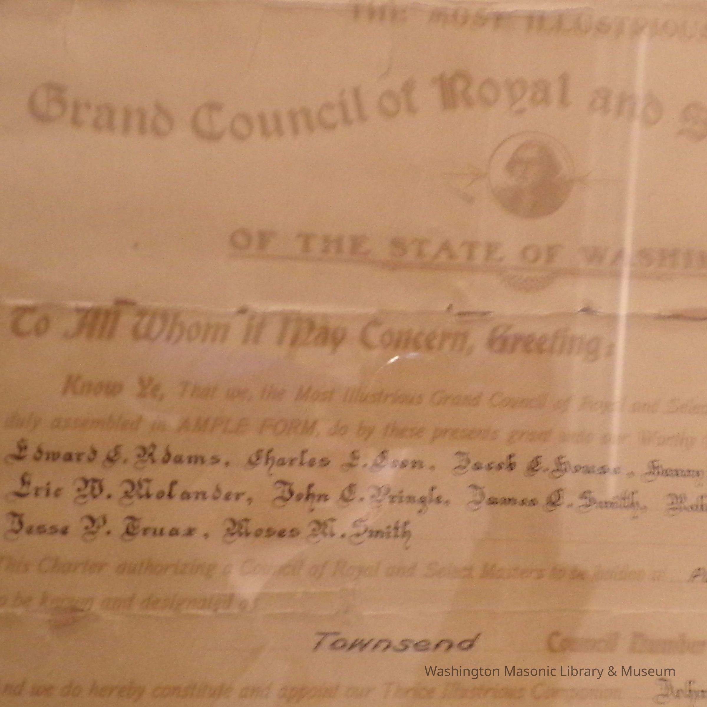 Charter: Framed. "Charter of Townsend Council #9 Royal and Select Masters." June 9, 1902. Donated by Alan Spreen. Poster reproduction accompanies original.Collection