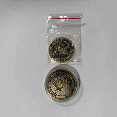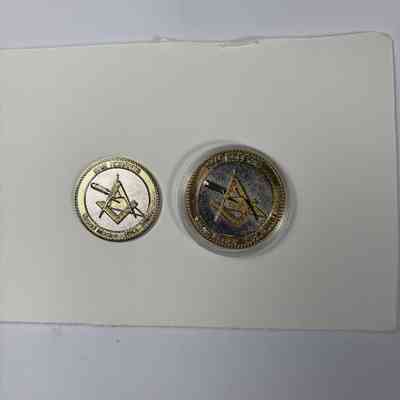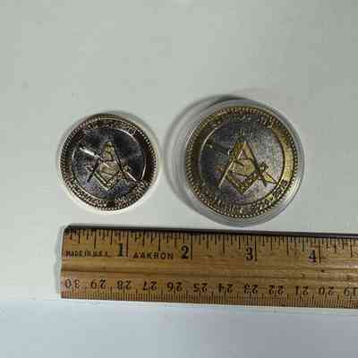 2 Coins: Two Past Grand Master Coins, MW Sam Roberts (2014-2015). Depicts Square and Compass and trowel on the front side. On the backside is the two pillars with the plumb, square, and level against a blue background.