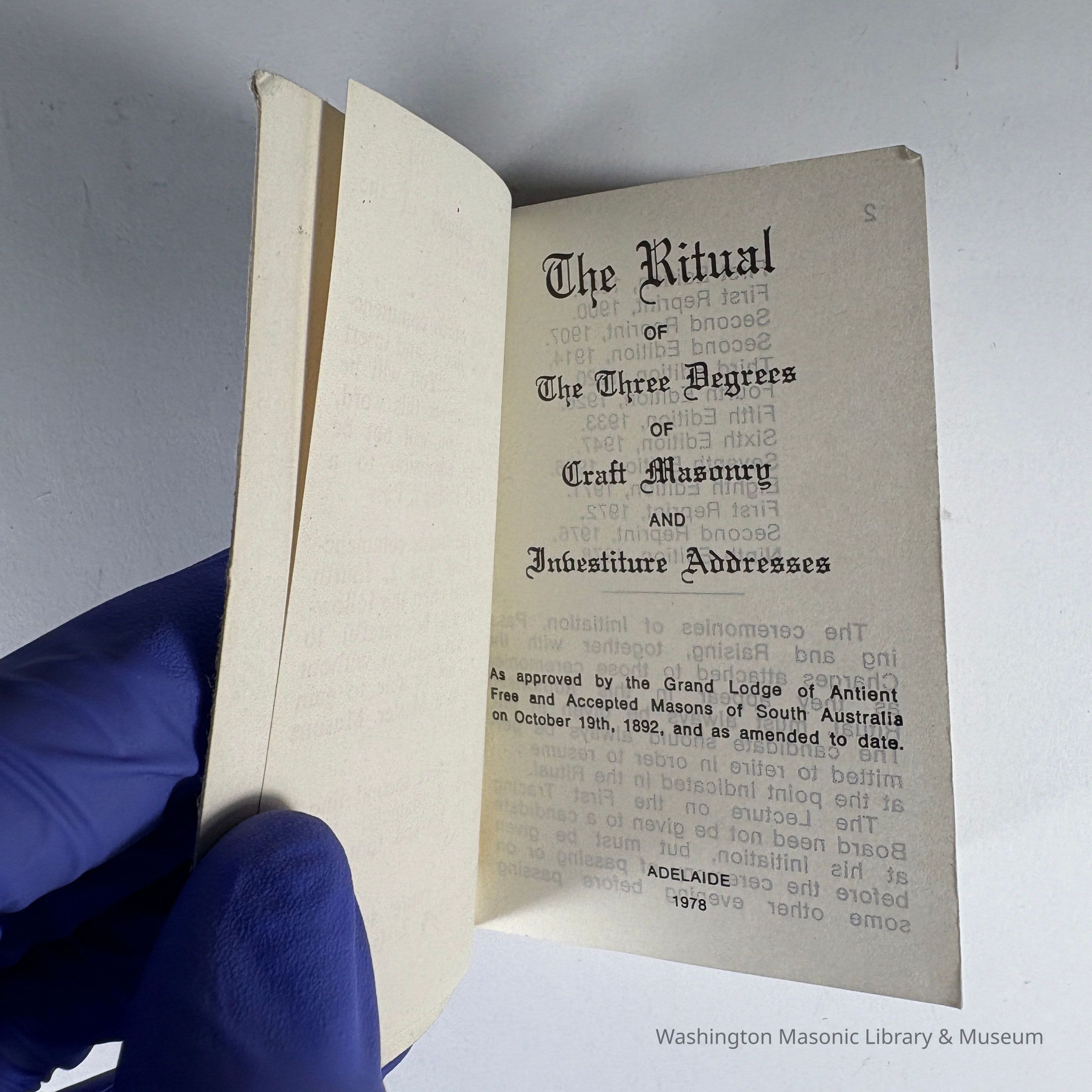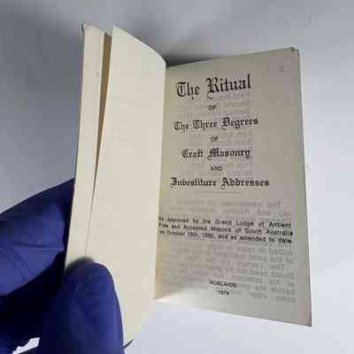 Monitor: Blue, with the writing "S. Kase/So Australia" on the cover. "The Ritual of the Three Degrees of Craft Masonry and Investiture Addresses" The Grand Lodge of Antient Free and Accepted Masons of South Australia, Adelaide (1978)