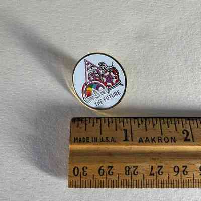 Pin: Circular. White. Symbols of all three youth groups: Rainbow Girls, DeMolay, and Job's Daughters. "The Future" Donated by PGM James O. Wood (c.1999)Collection