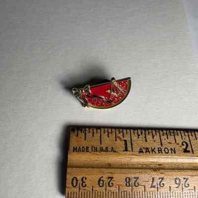 Pin: Watermelon half with a bow on the left and square and compass on right. Found in a cash of pins donated by PGM James O. Wood.Collection