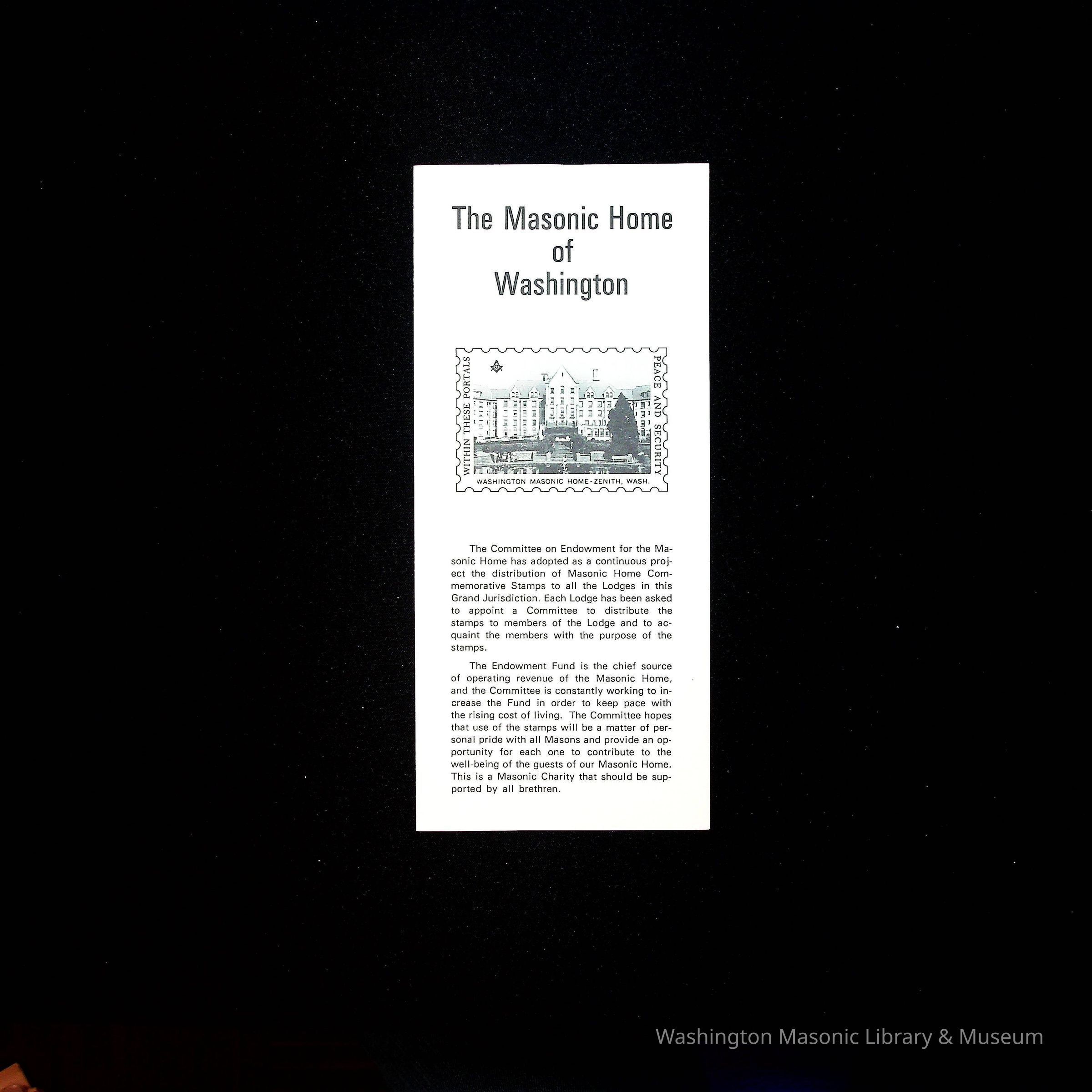 a) Stamps: Stamp books in File folder of the Masonic Home of Washington at Zenith, Washington. Originally 4 sheets of stamps, but we have only retained one. b) Flier found in same file folder as stamps.Collection