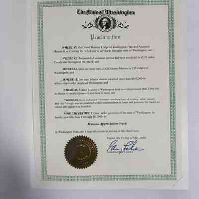 "Now, Therefore, I, Gary Locke, governor of the state of Washington, do hereby proclaim June 4 through 10, 2000, as Masonic Appreciation Week in Washington State, and I urge all citizens to join me in this observance. Signed this 1st day of May, 2000."Collection