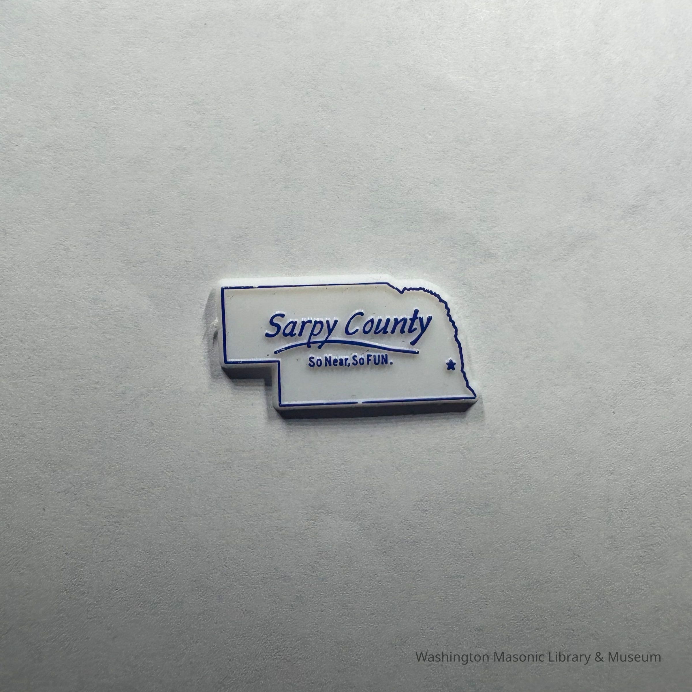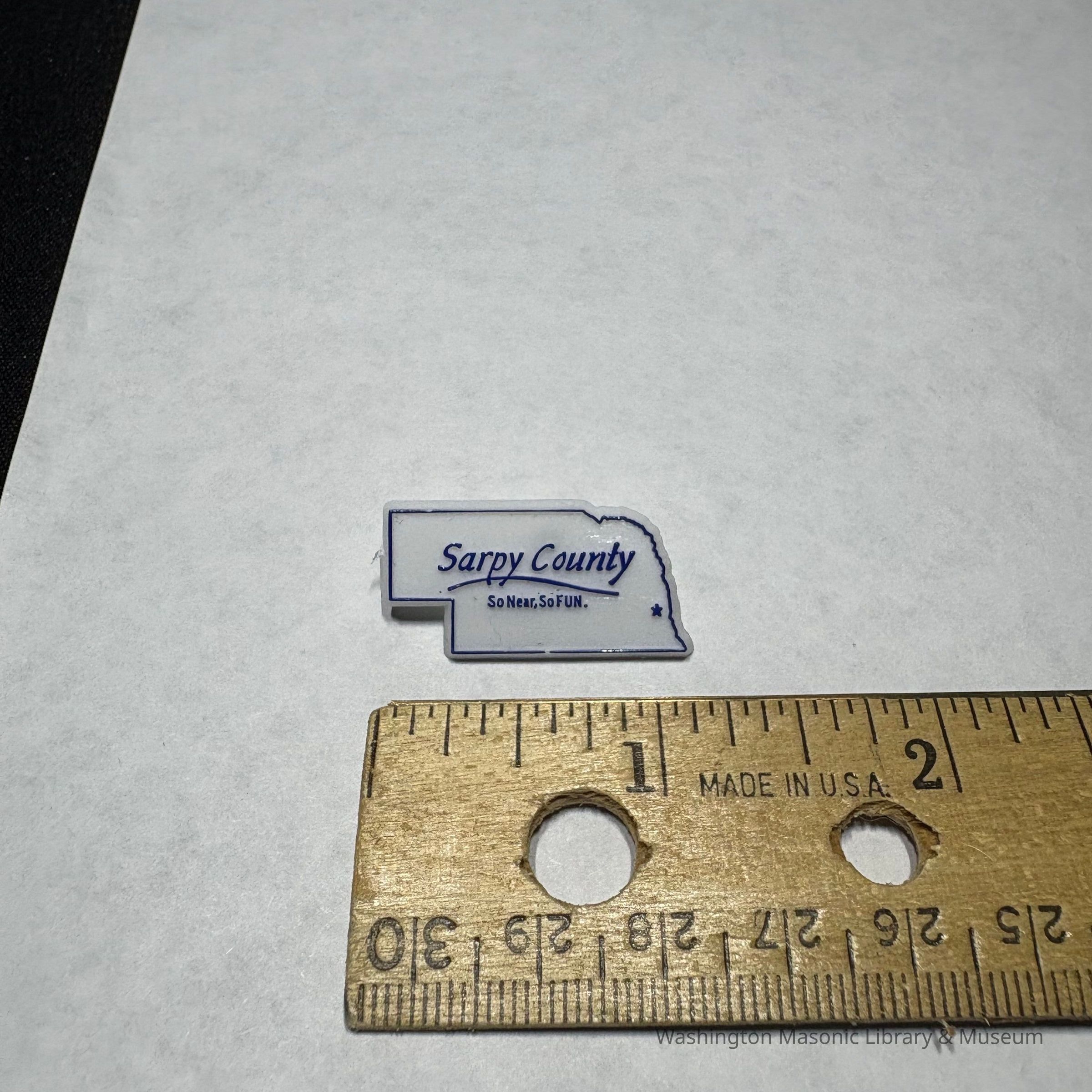 Pin: "Sarpy County: So neat, so fun". In the shape of the State of Nebraska. Collected by PGM Sam Roberts (c.2015)Collection