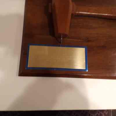Gavel on plaque: Wooden. Presented to GM Bill Horn by Haller Lake Lodge 296. Gavel used at 9th Annual outdoor communication for 296. August 15, 1972.