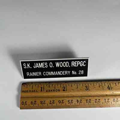 Name tag: Black and White. "S.K. James O. Wood, REPGC, Rainier Commandery No. 28" Belonged to PGM James O. Wood.