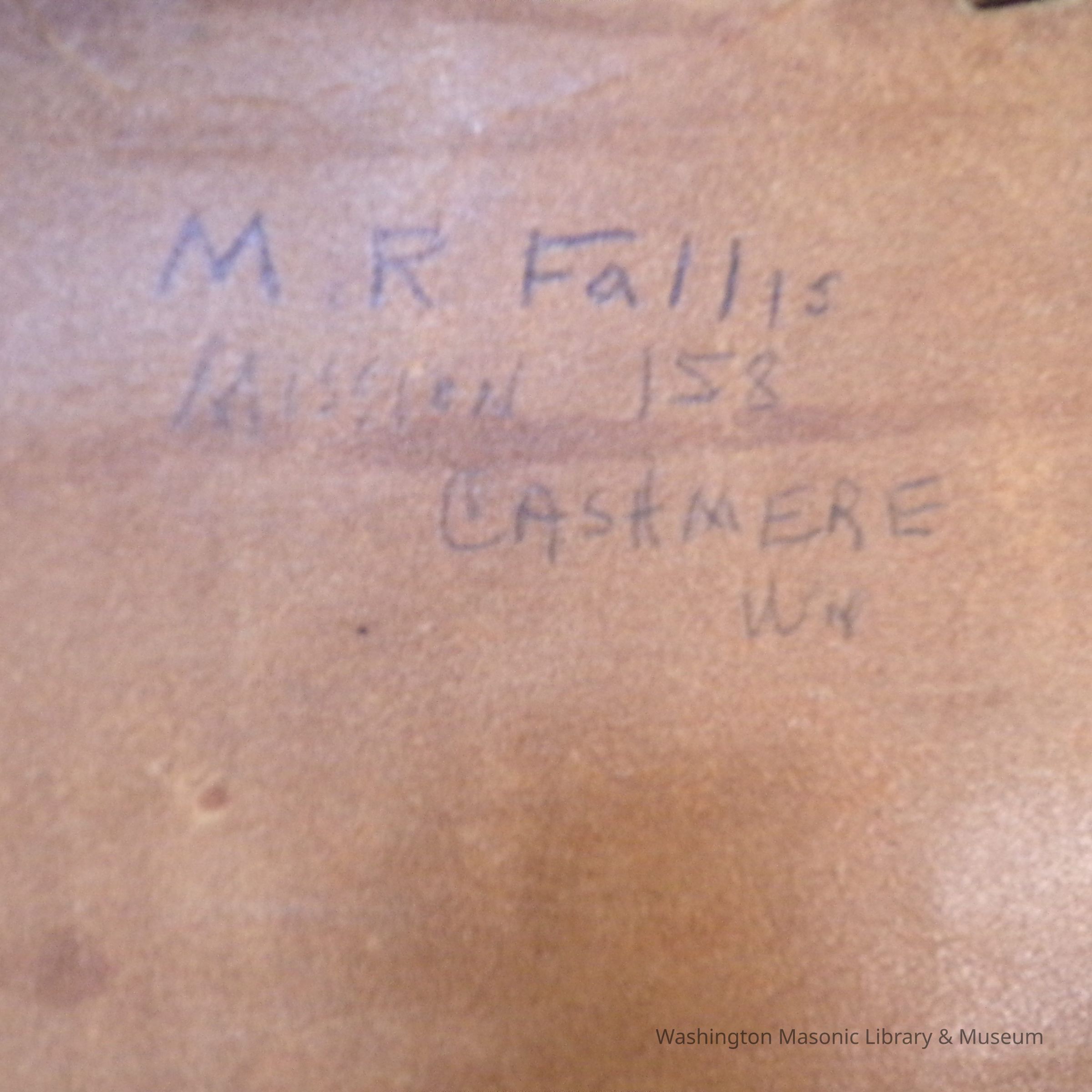 Empty leather apron case. Inside is written: "M.R. Fallis, Mission 158 Cashmere, WA"