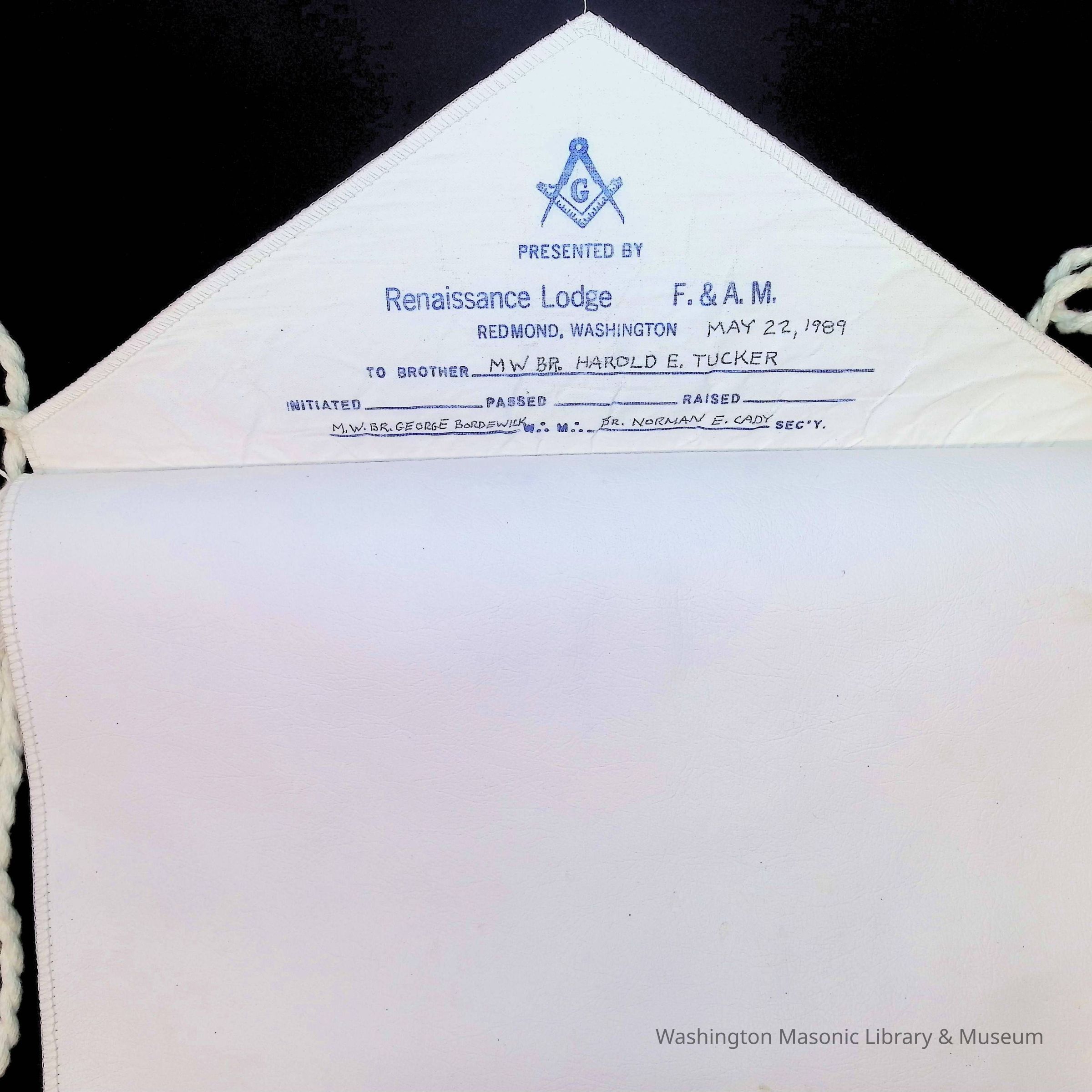 Apron: Gift to MWB Harold Tucker during his year as Grand Master (1988-1989). Gifted to him by Renaissance Lodge No. on May 22, 1989. Worshipful Master George Bordewick, Past Grand Master (1982-1983).Dimensions