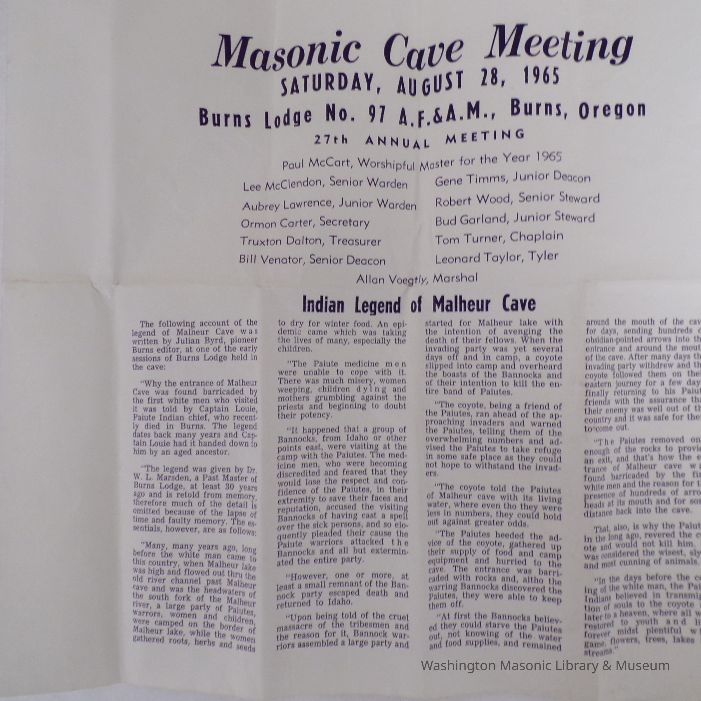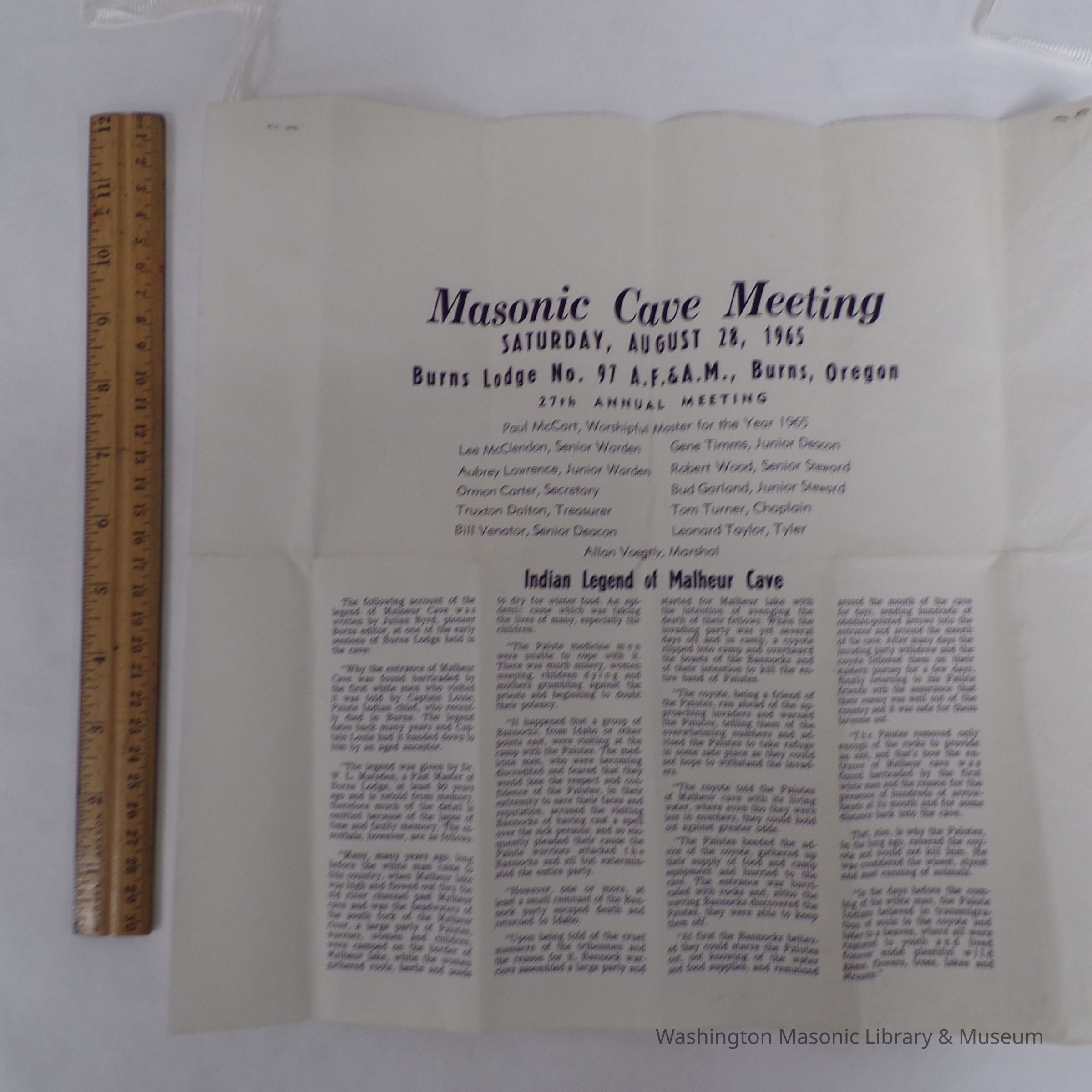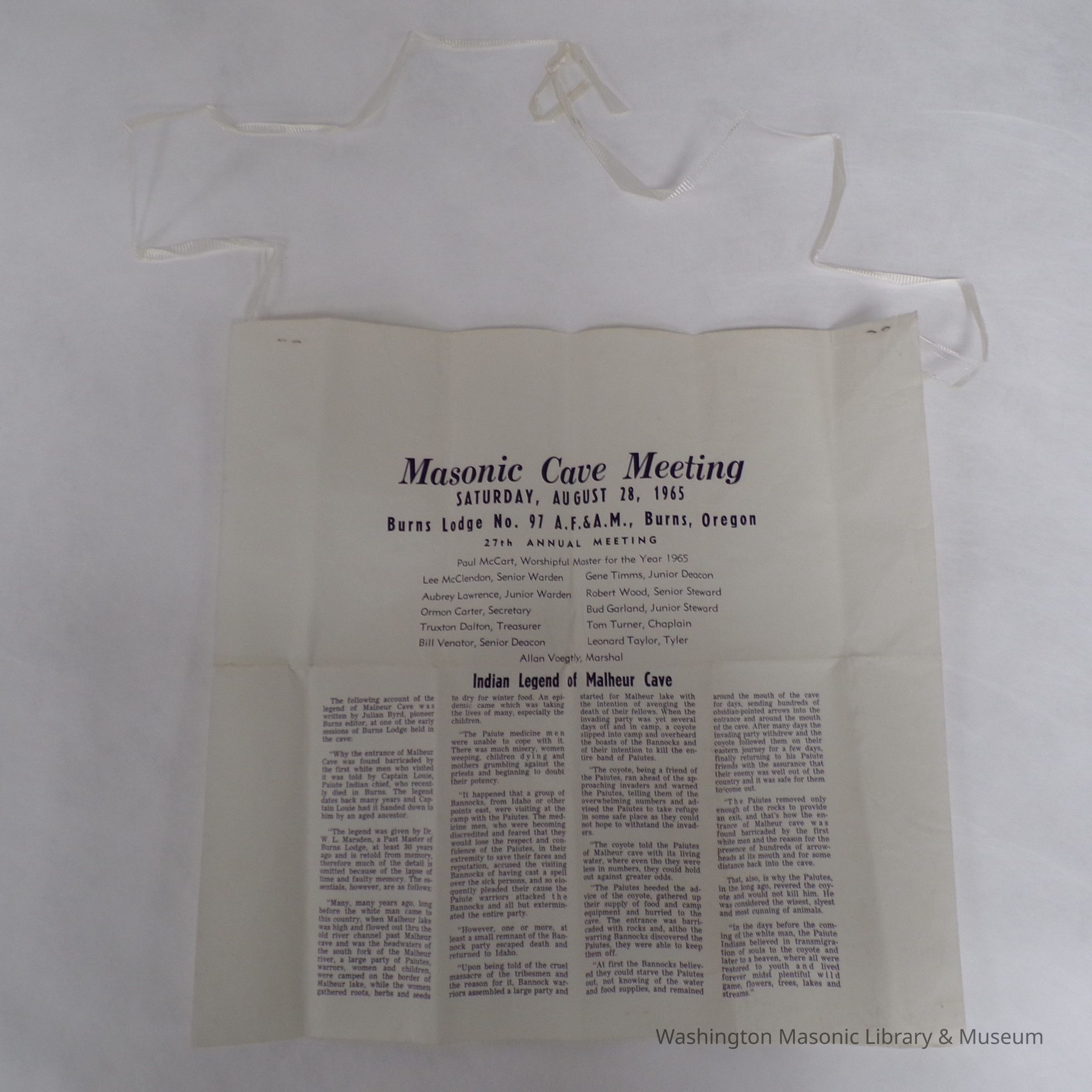 Apron: Paper. Masonic Cave Meeting, Burns Lodge, Burns, Oregon (1965)Entry/Object ID