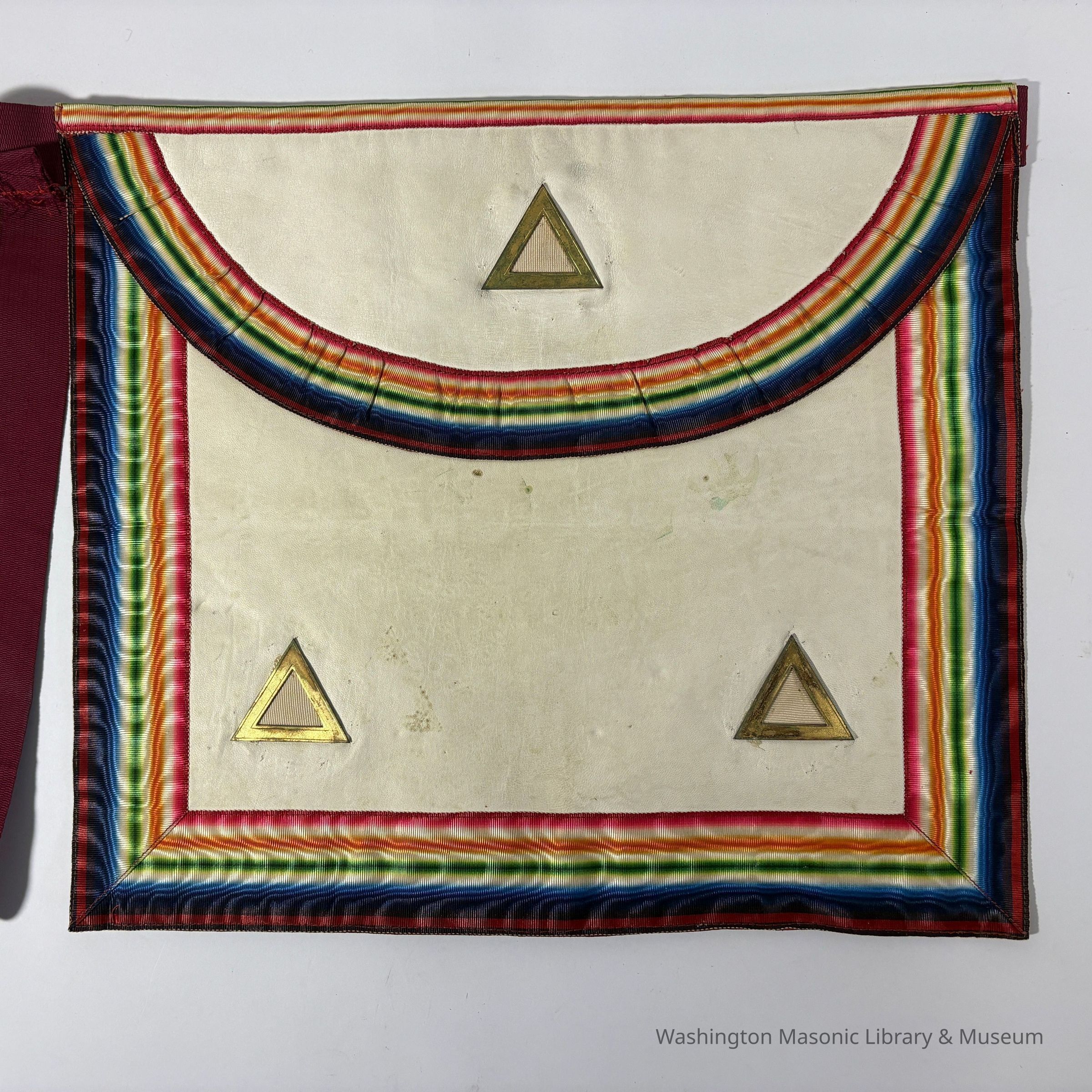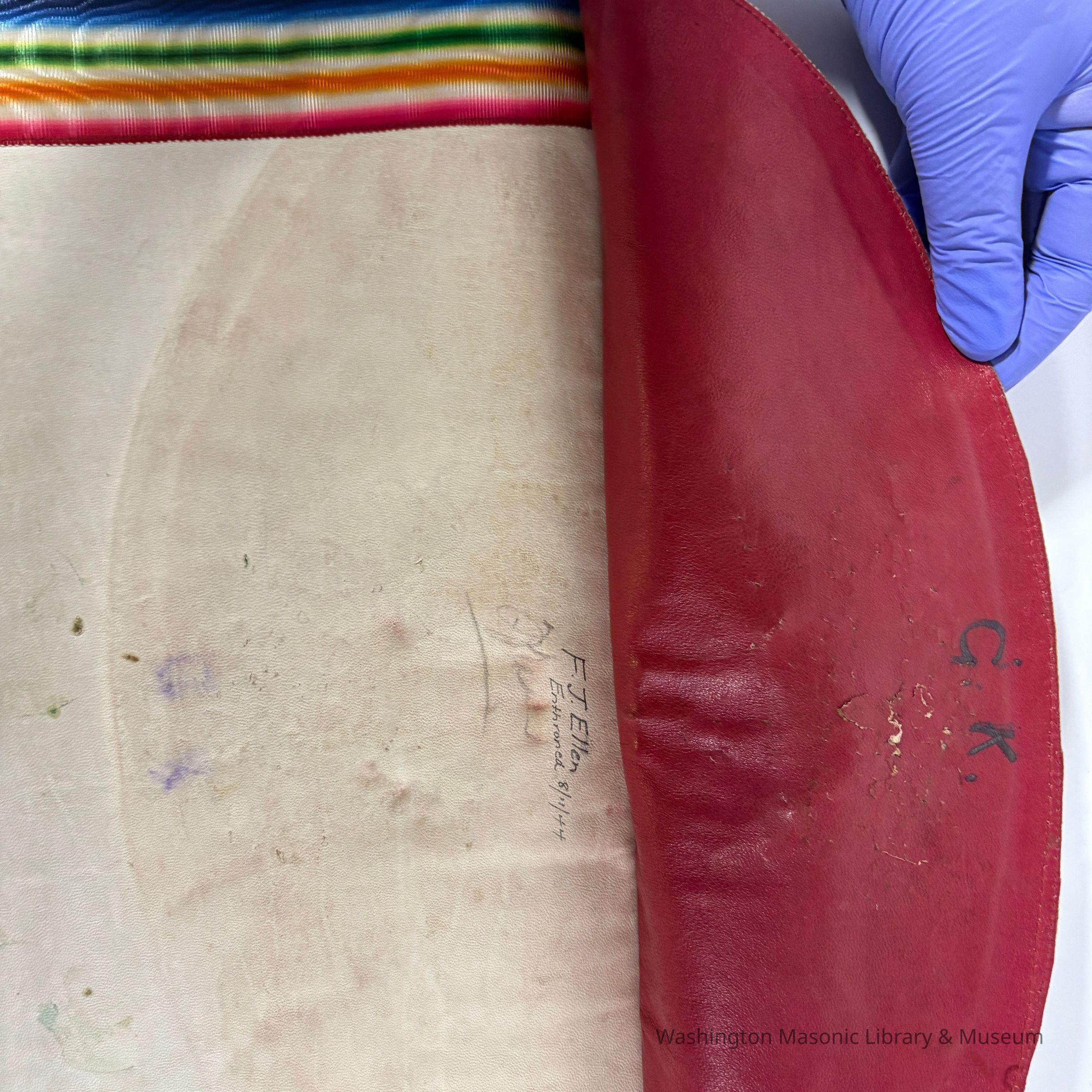 Apron: Leather and fabric. White and rainbow. Royal Ark Mariner. Belonged to F.J. Ellen (1944)