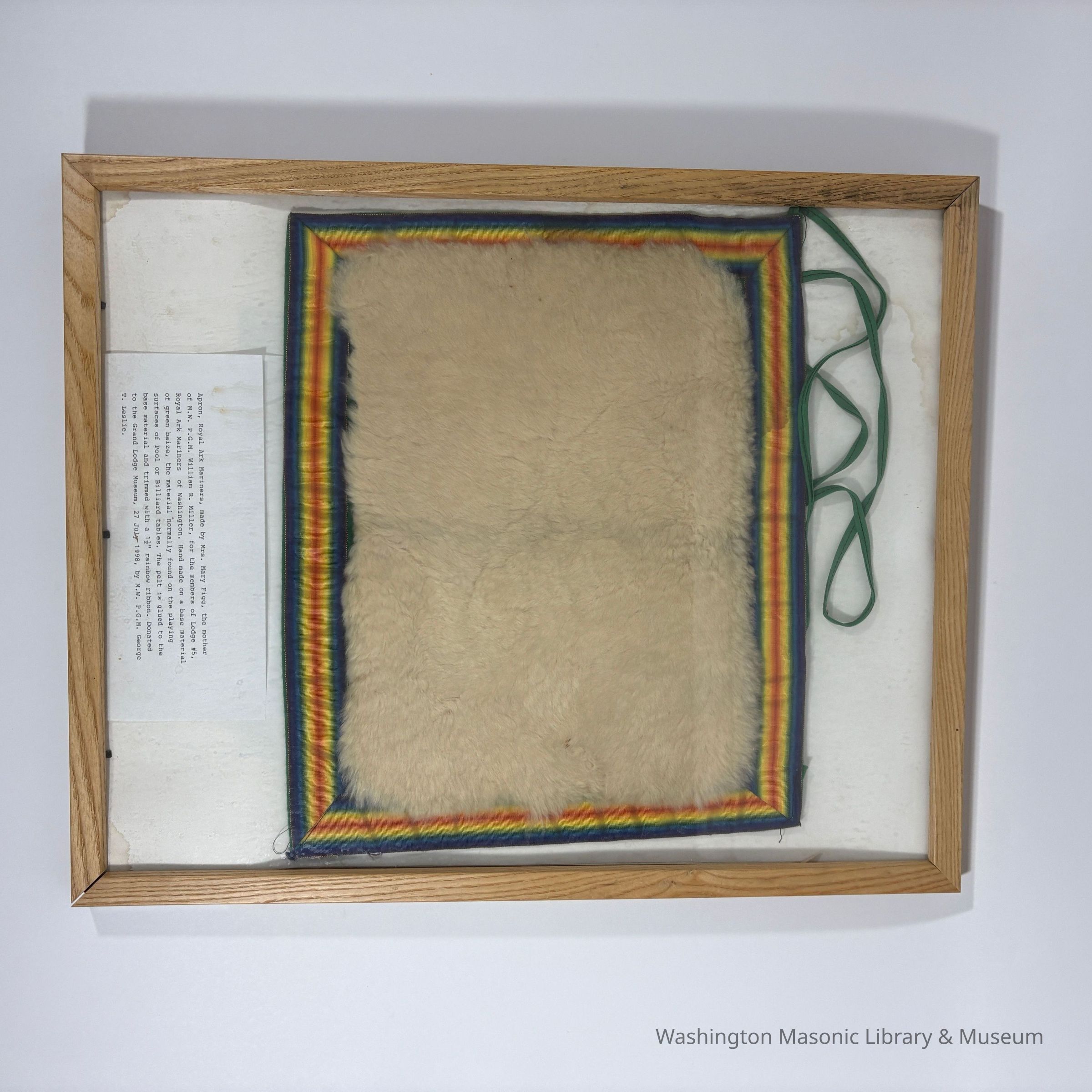 Apron: Royal Ark Mariners Apron. Made by Mrs. Mary Figg, mother of Most Worshipful Past Grand Master William r. Miller for the members of Lodge #5 Royal Ark Mariners of Washington.Collection