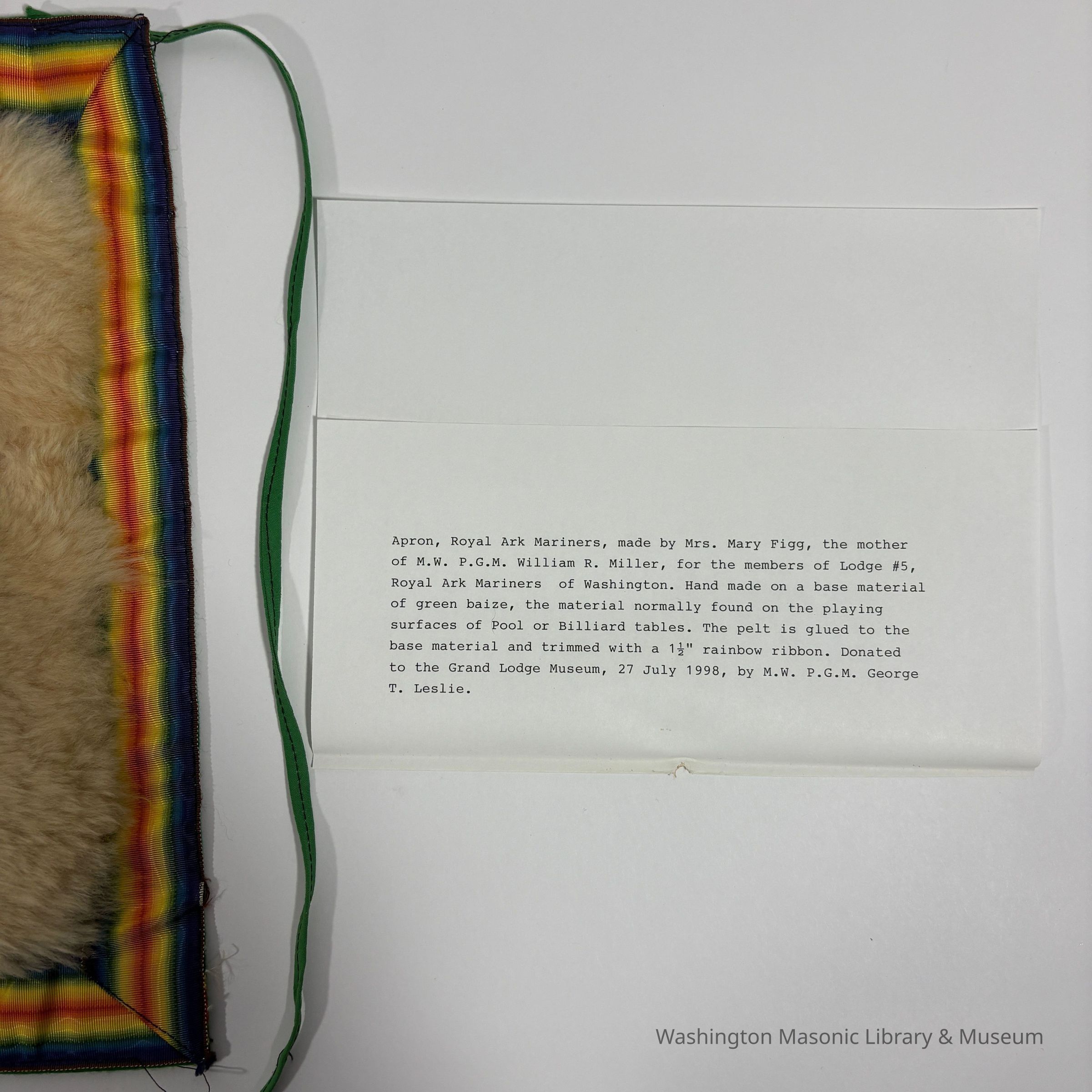 Apron: Royal Ark Mariners Apron. Made by Mrs. Mary Figg, mother of Most Worshipful Past Grand Master William R. Miller (late 20th Century)Entry/Object ID