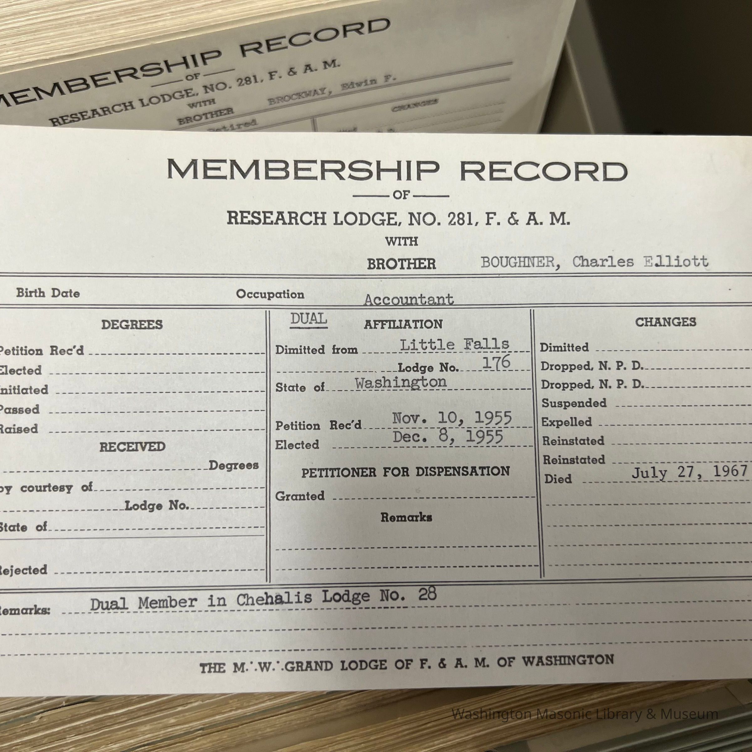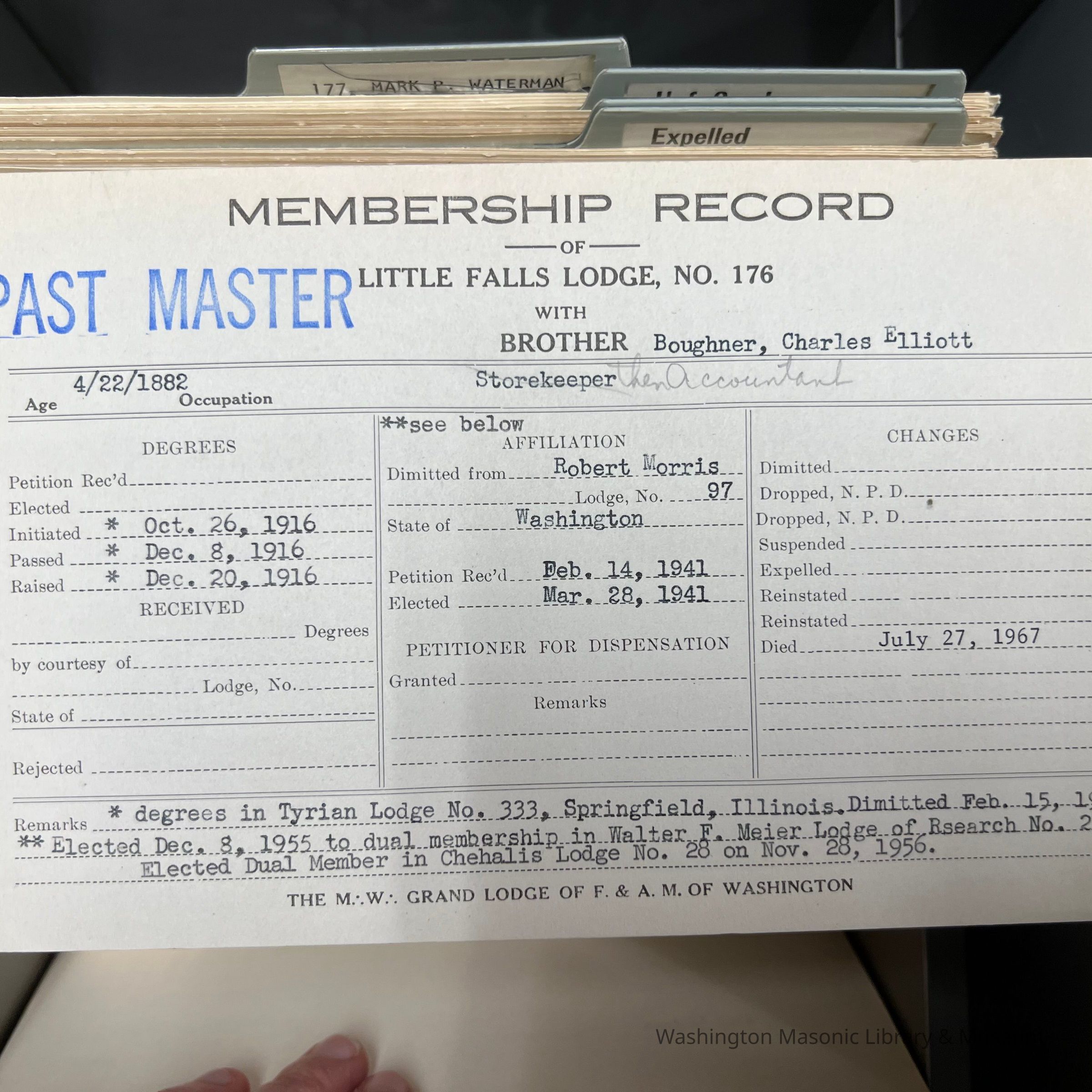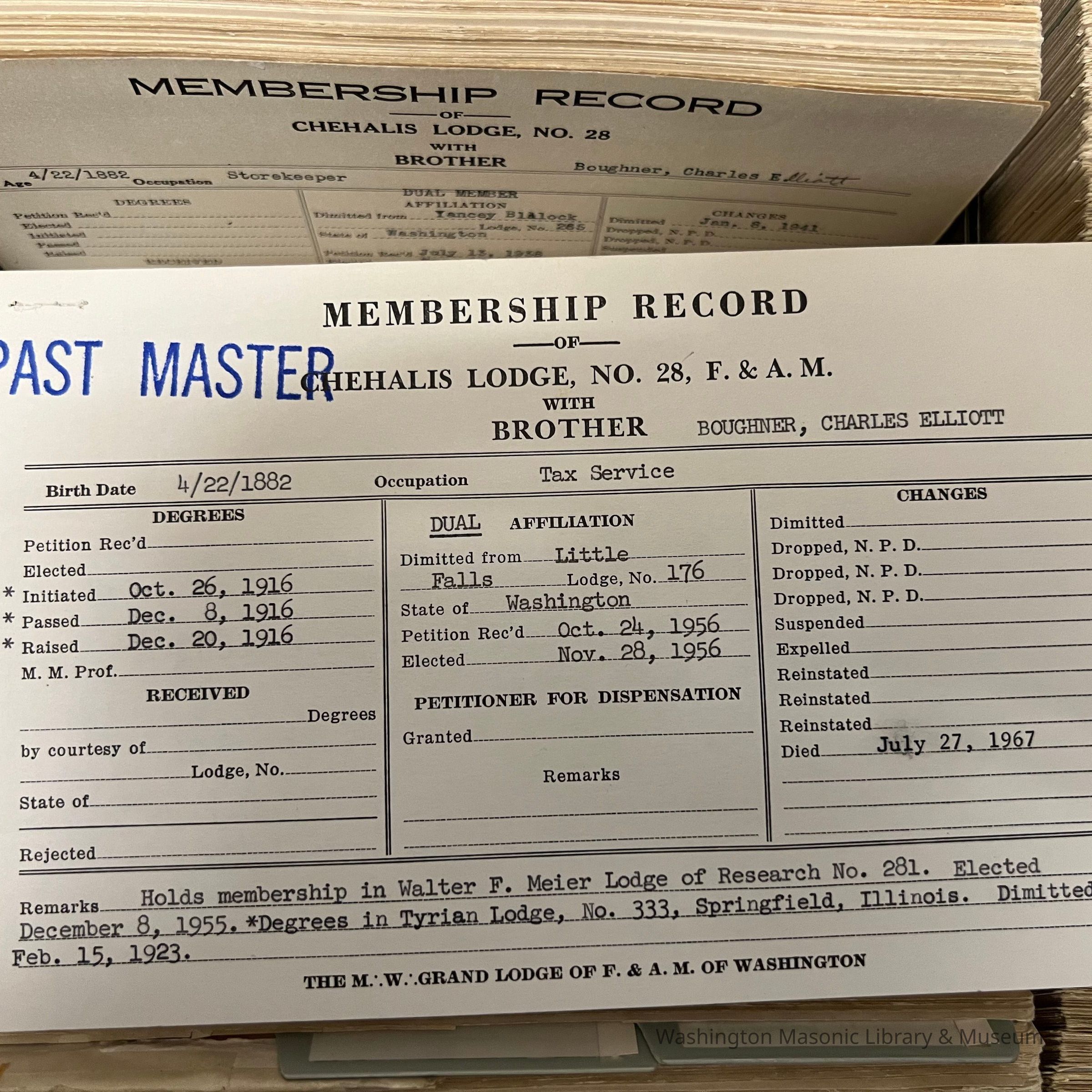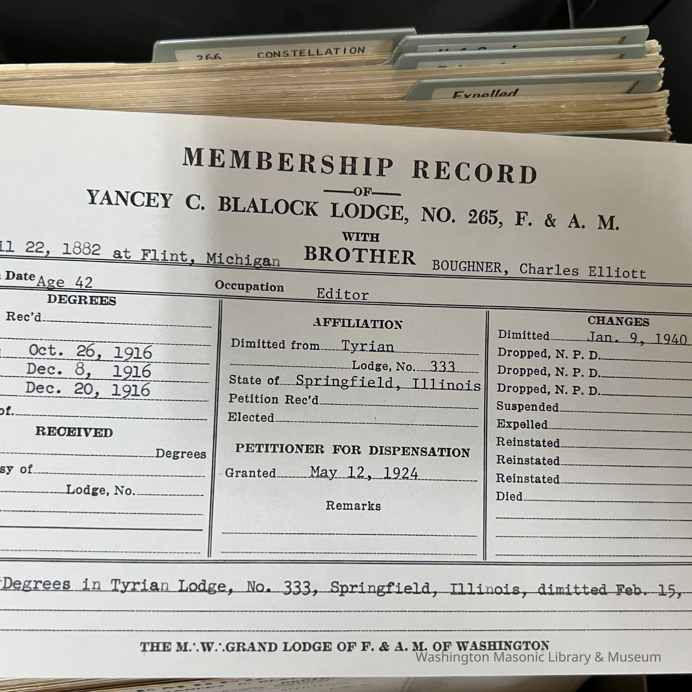 Associated with 2019-A70-01, apron belonging to Charles E. Boughner. Apron is from Tyrian Lodge 333, Springfield IL, where he was raised in 1916. Boughner later moved to Washington and joined Yancey Blalock Lodge 265.Collection