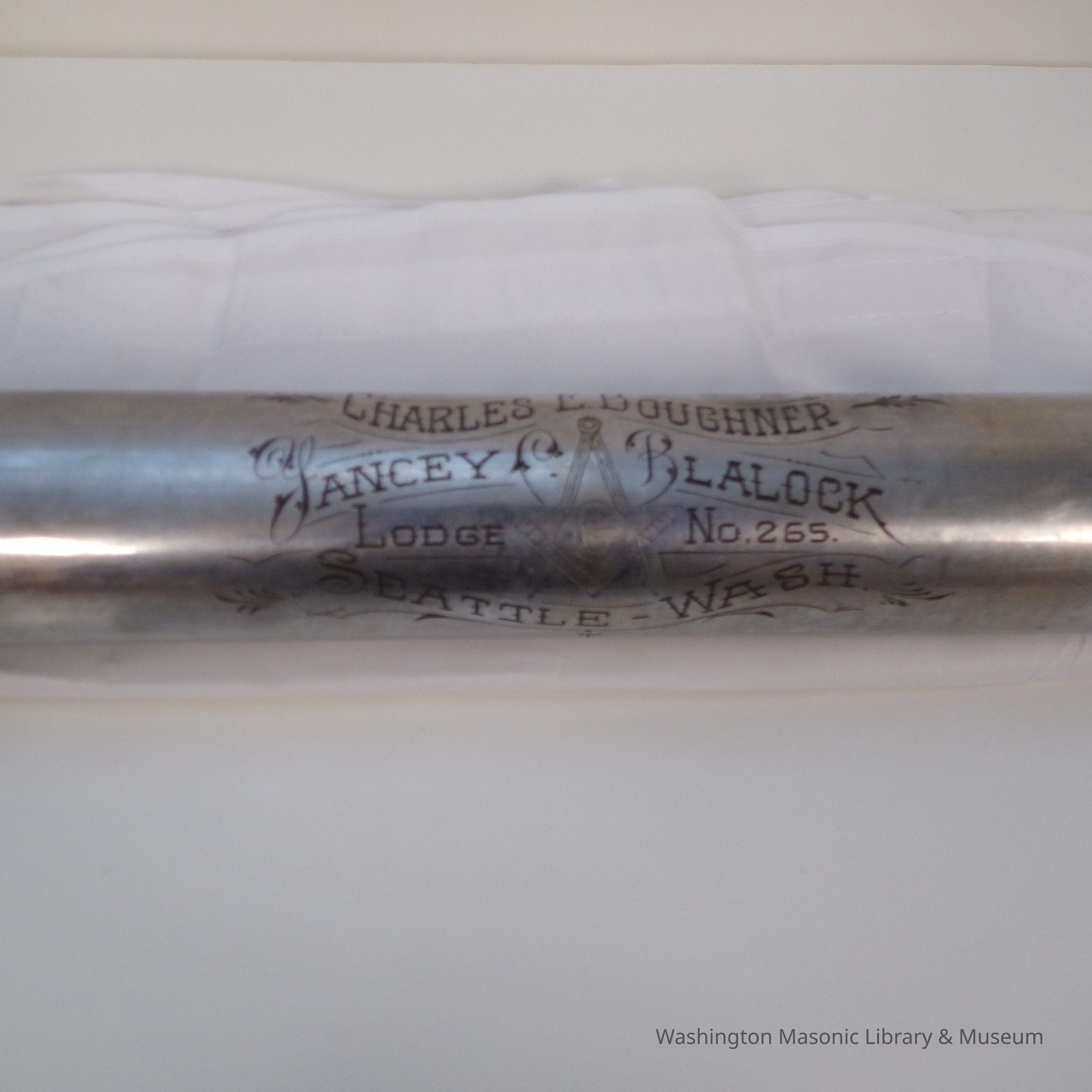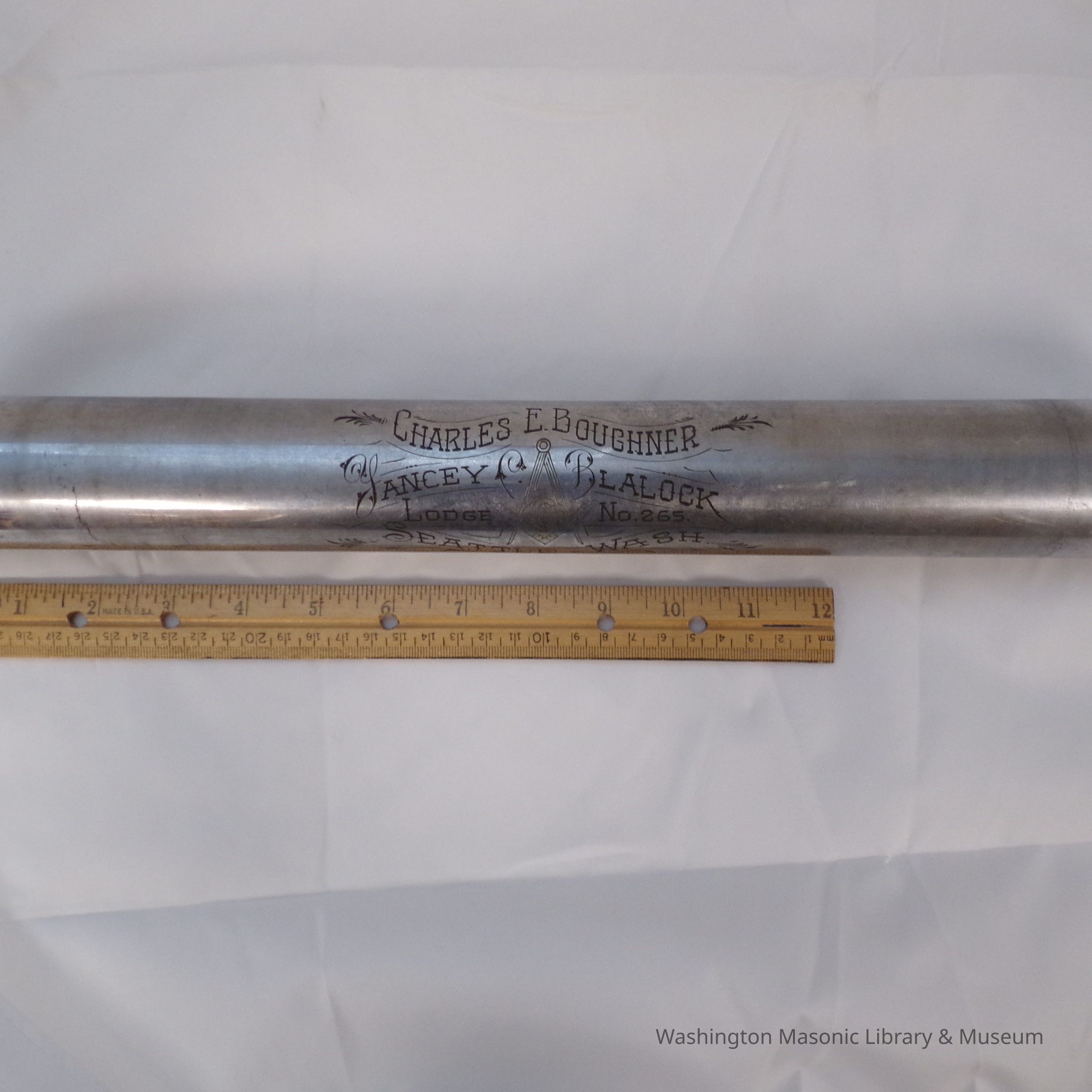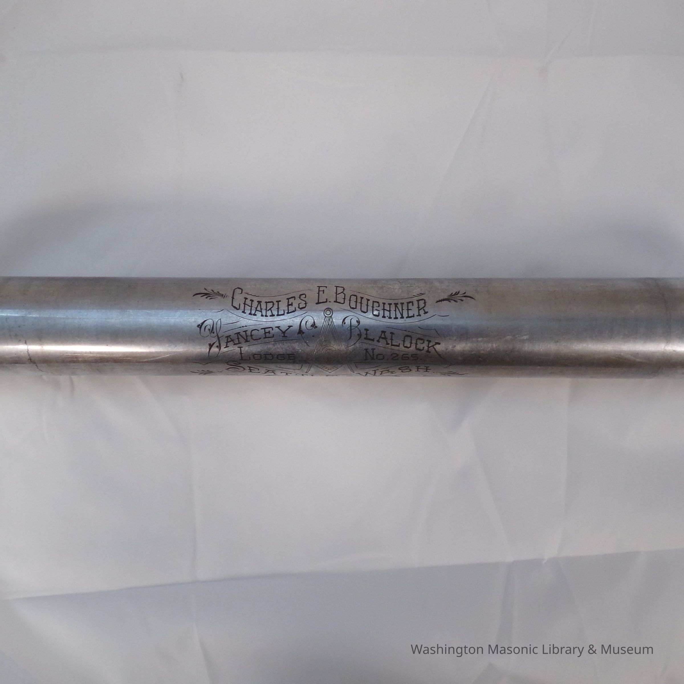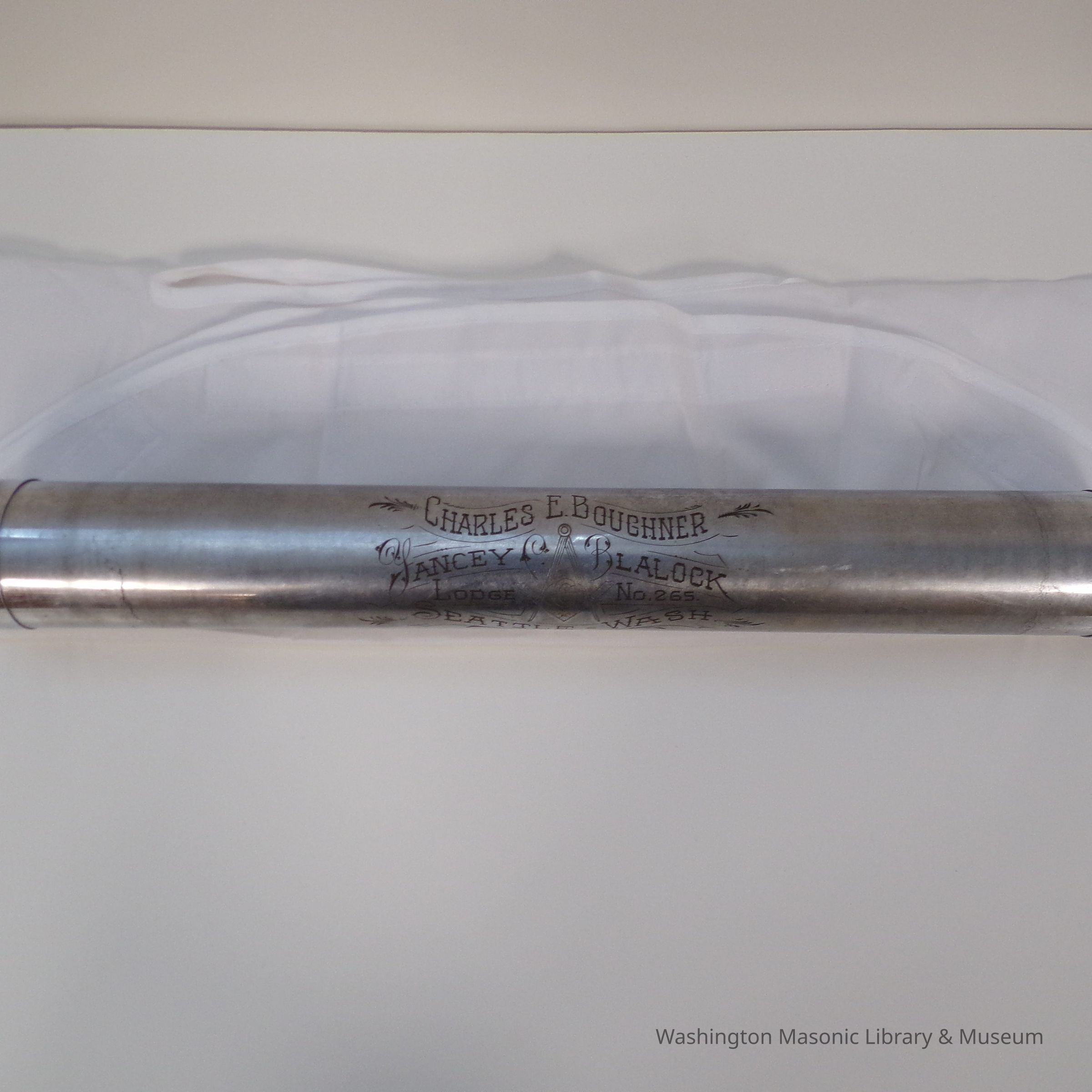 One Apron Tube: Metal with writing etched into it" Charles E. Boughner, Yancey Blalock Lodge No. 265 Seattle WA