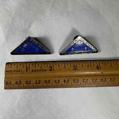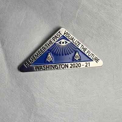 2 pins: Triangular. Silver and Blue. Two Past Grand Master pins, MW Chris J. Coffman (2020-2021). Depicts Coffman's slogan around the outside: "Remember the Past/Visualize the Future/Washington 2020-21". On the inside is the All Seeing Eye overlooking two squares and compasses.