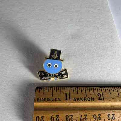 Pin: Blue and black with gold trim. Cartoon wearing top hat with square and compass. "Unite in the Grand Design." This design was invented by PGM James O. Wood and represented his year as Grand Master (1977-1978). Donated by PGM James O. Wood (c.1978)Collection