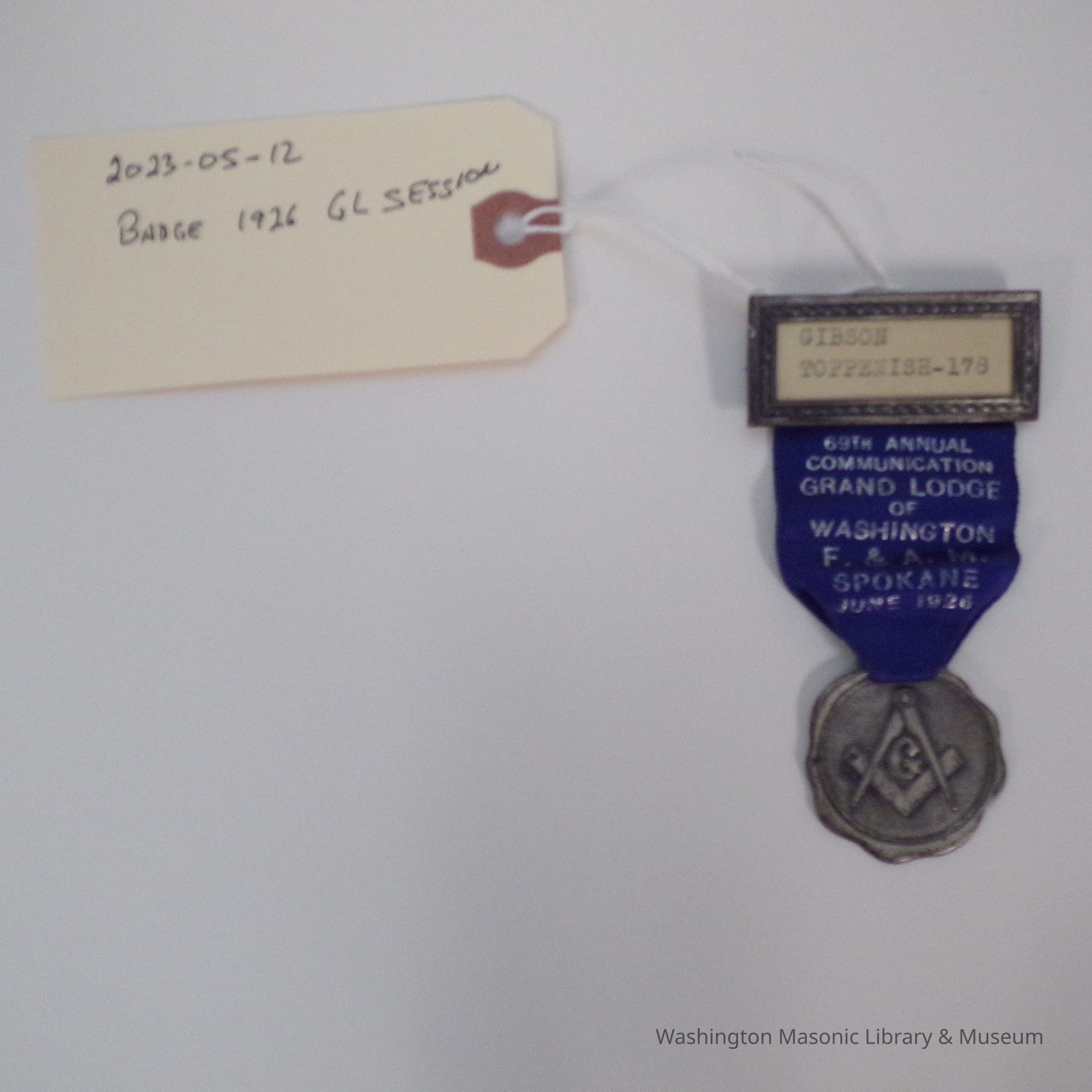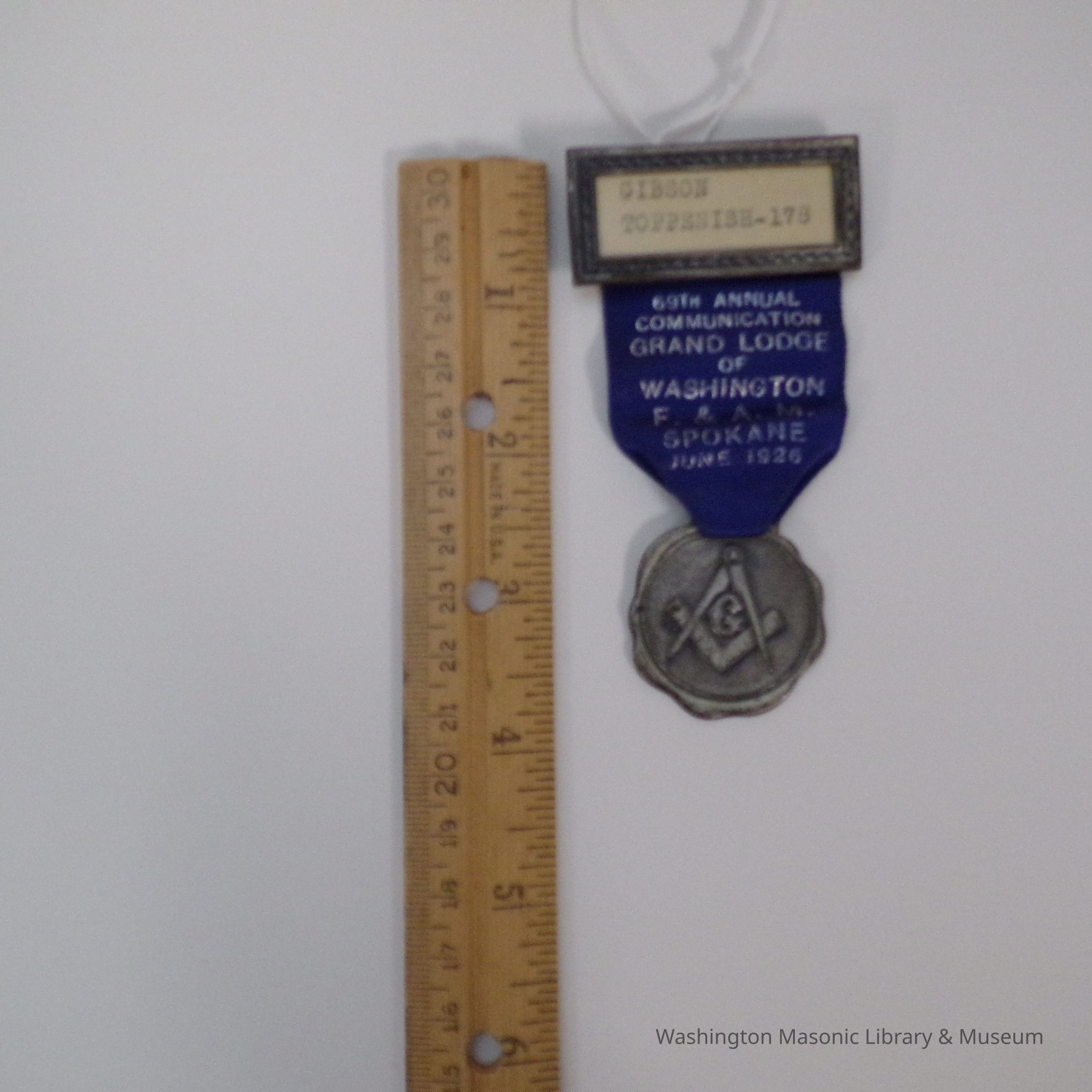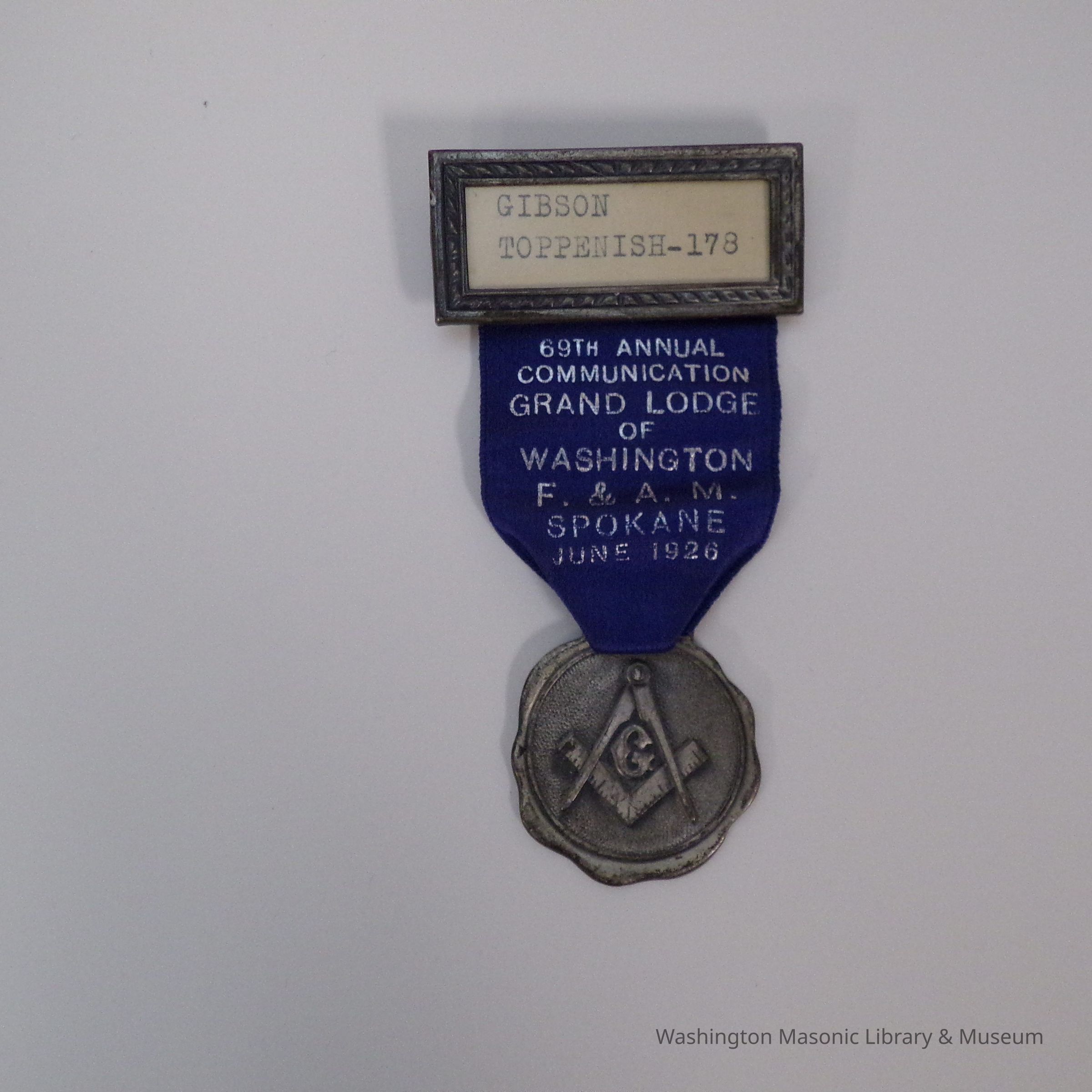 Badge worn at the 69th Annual Communication of Grand Lodge of Washington in Spokane (1926) by Gibson Toppenish of Lodge #178Material