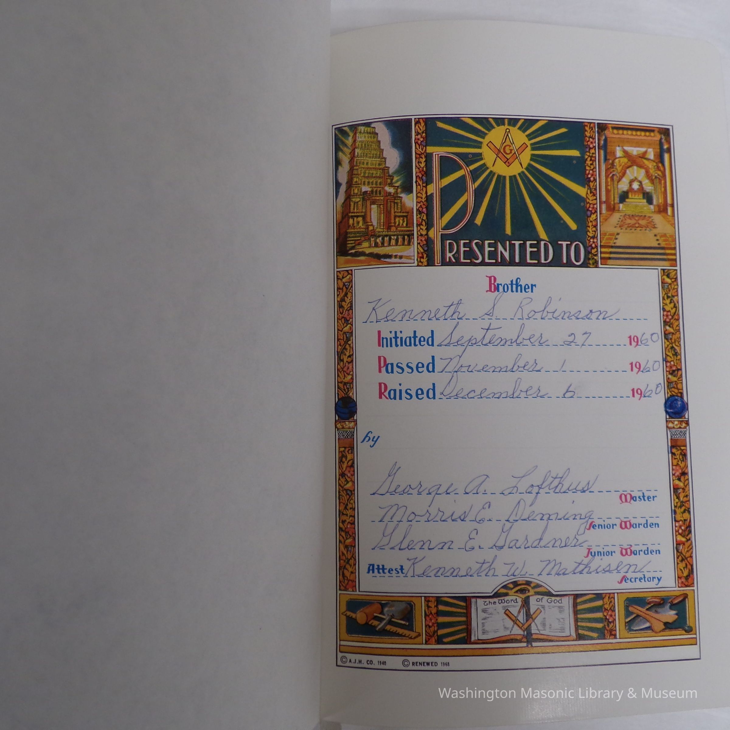 Bible: Holman Masonic Bible. Belonged to PGM Kenneth Robinson (1960)
