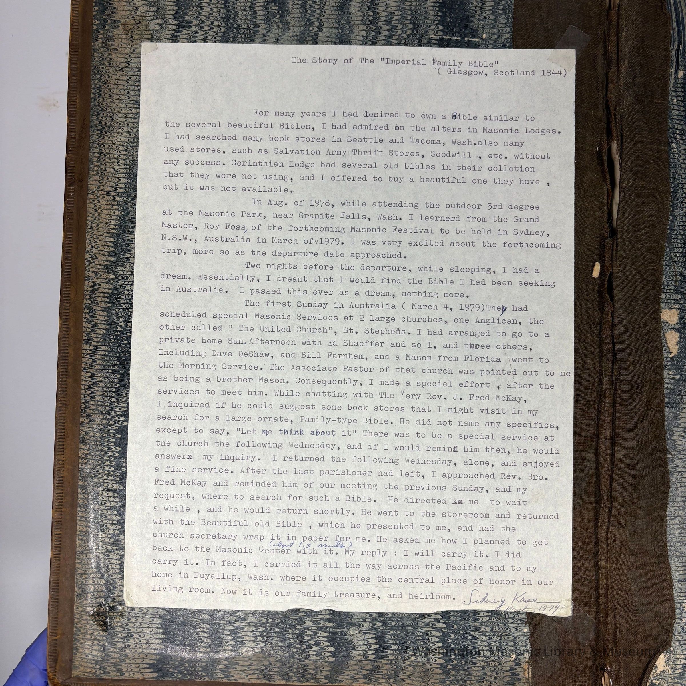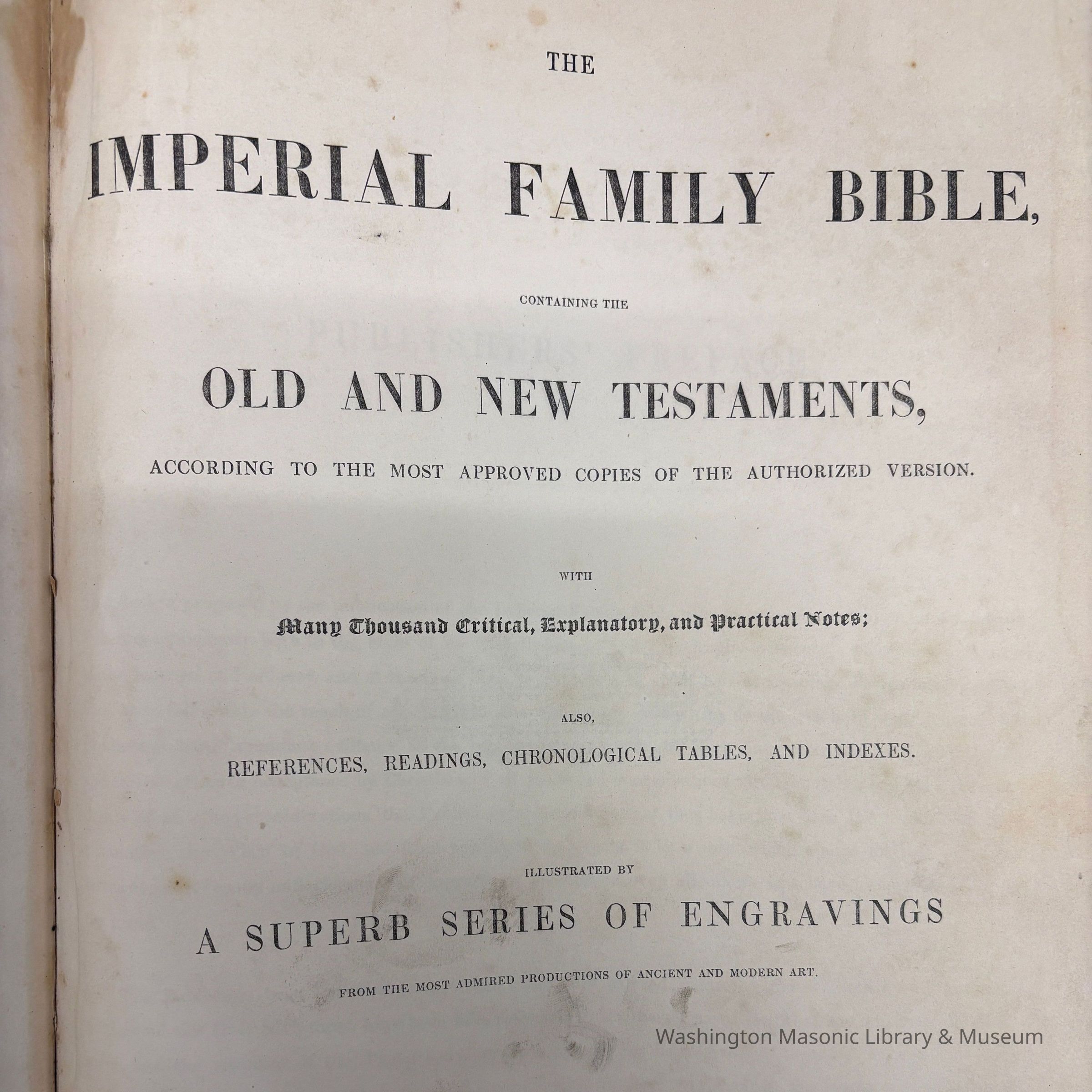 Bible: Imperial Family Bible Containing the Old and New Testaments, Glasgow, Scotland (1844). Collected by PGM Sidney Kase during a trip to Sydney, Australia in 1979.Collection