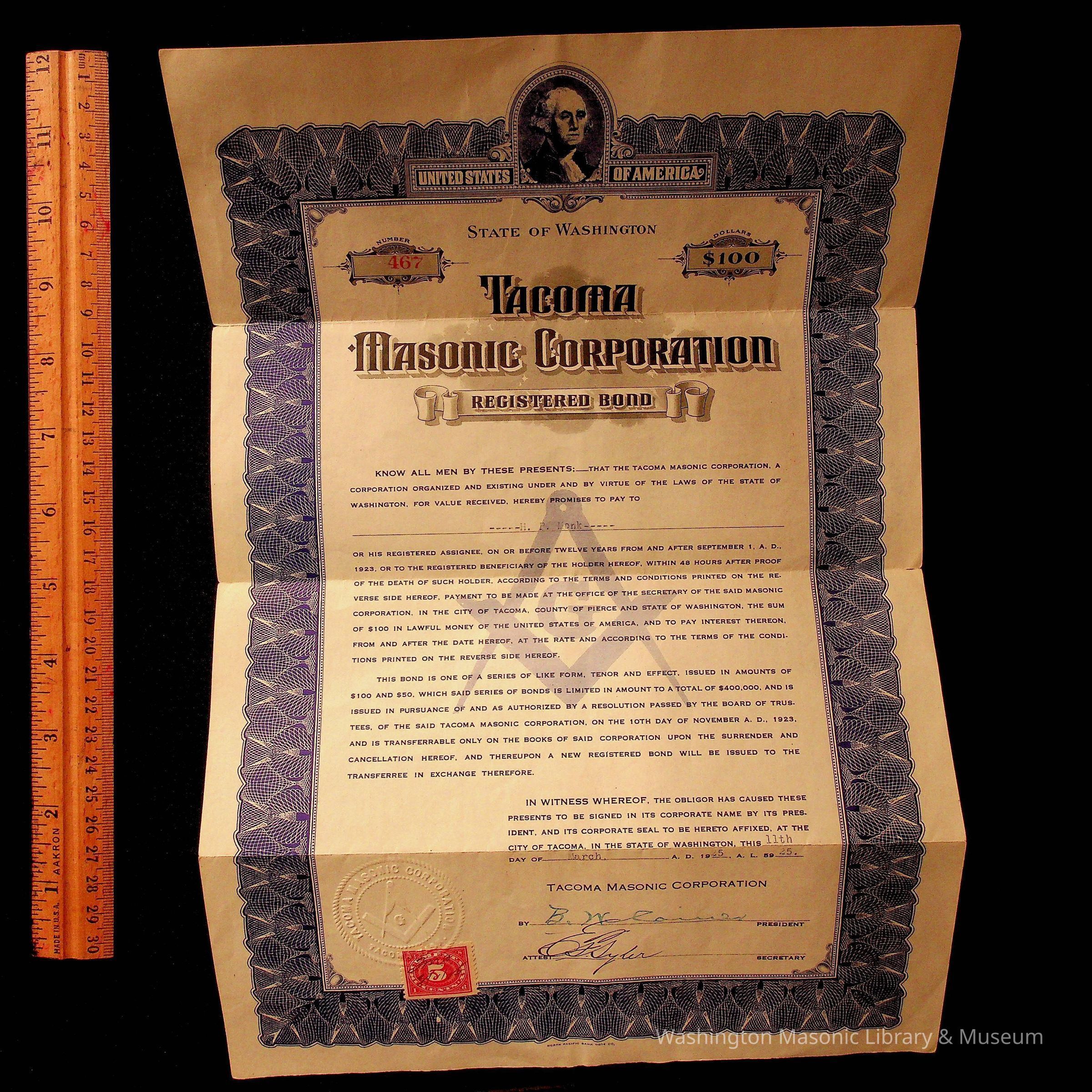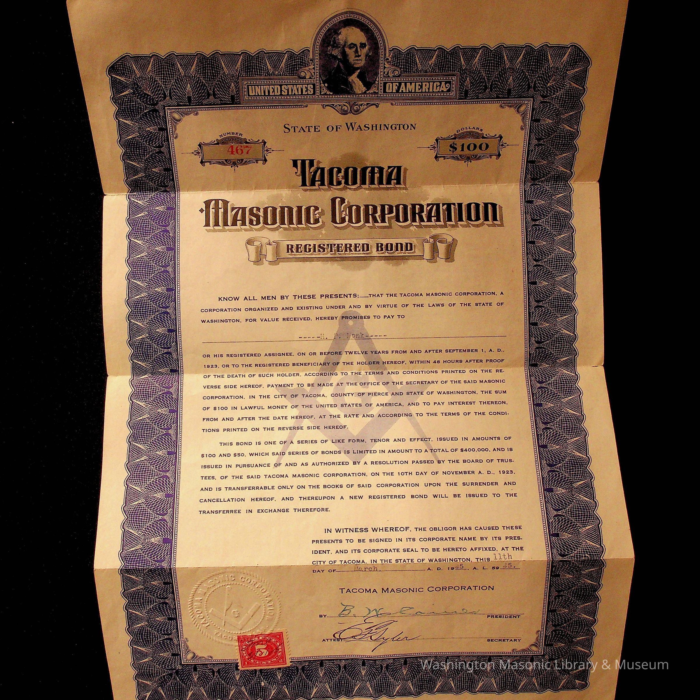 Bond: Registered Bond for 100 dollars from the Tacoma Masonic Corporation for H.P. Monk. Issued in 1923.Collection