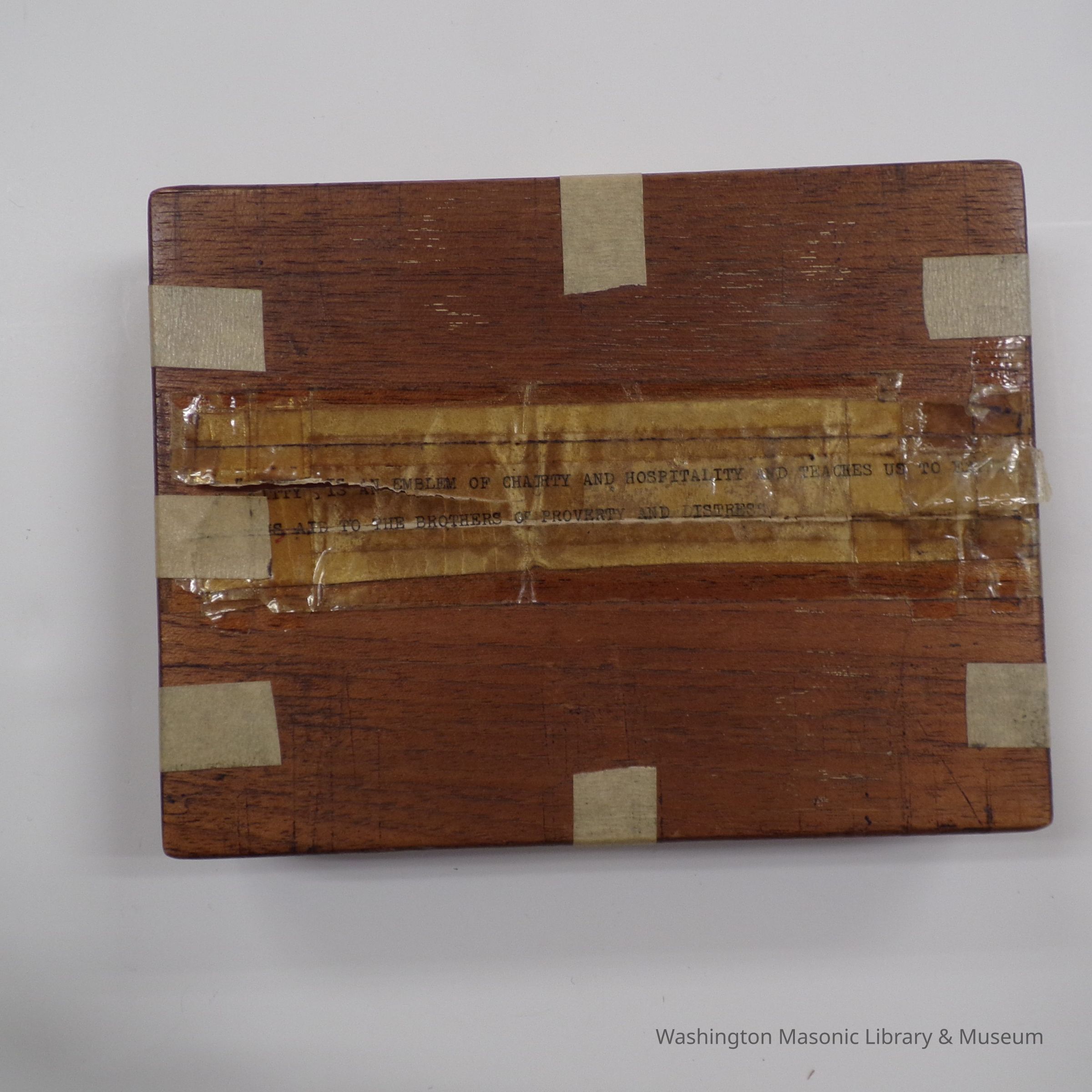Box and Lid: Typed label on the lid's face reads, ""Kitty(?)" is an emblem of Charity and Hospitality and teaches us to extend (?) aid to the Brothers of poverty and distress"