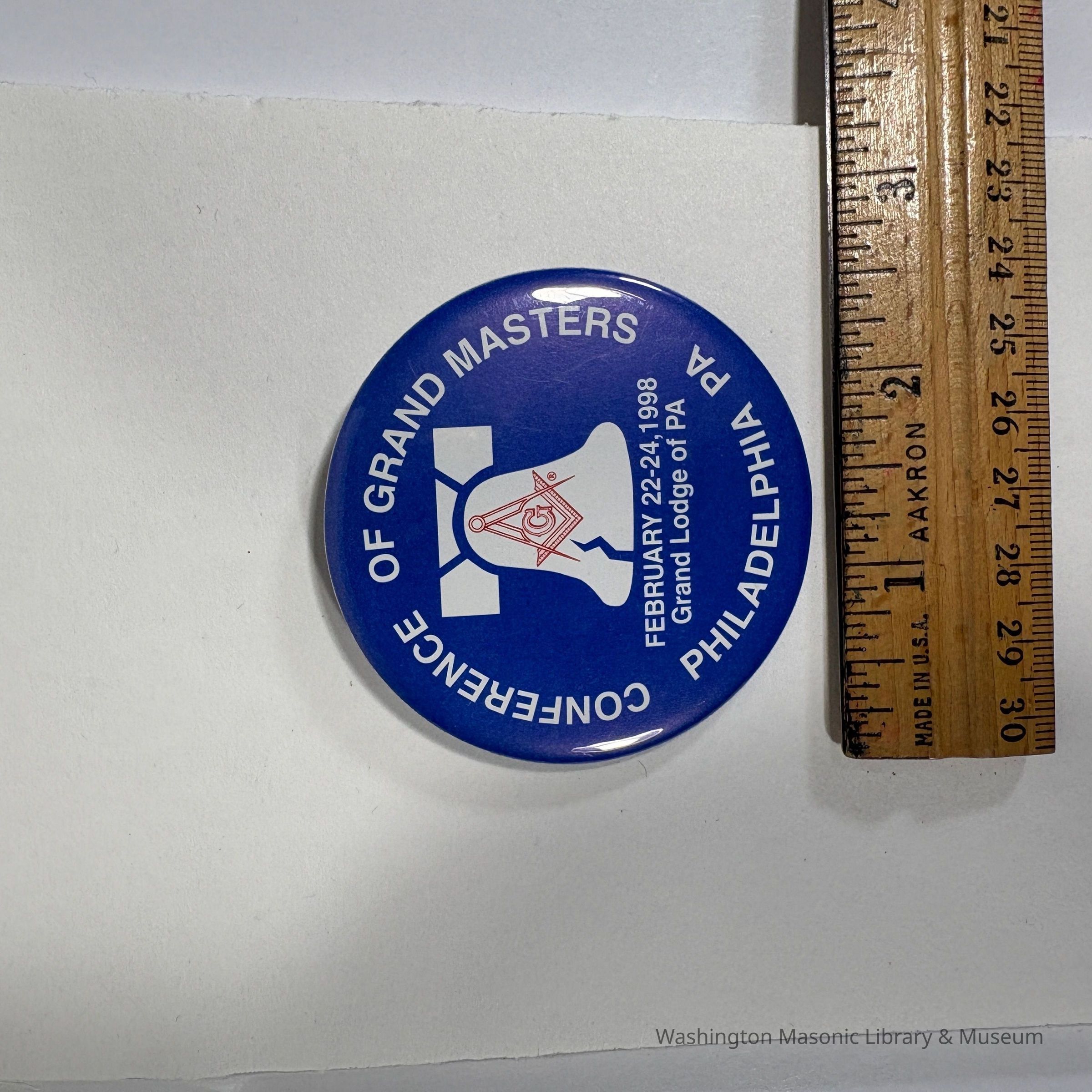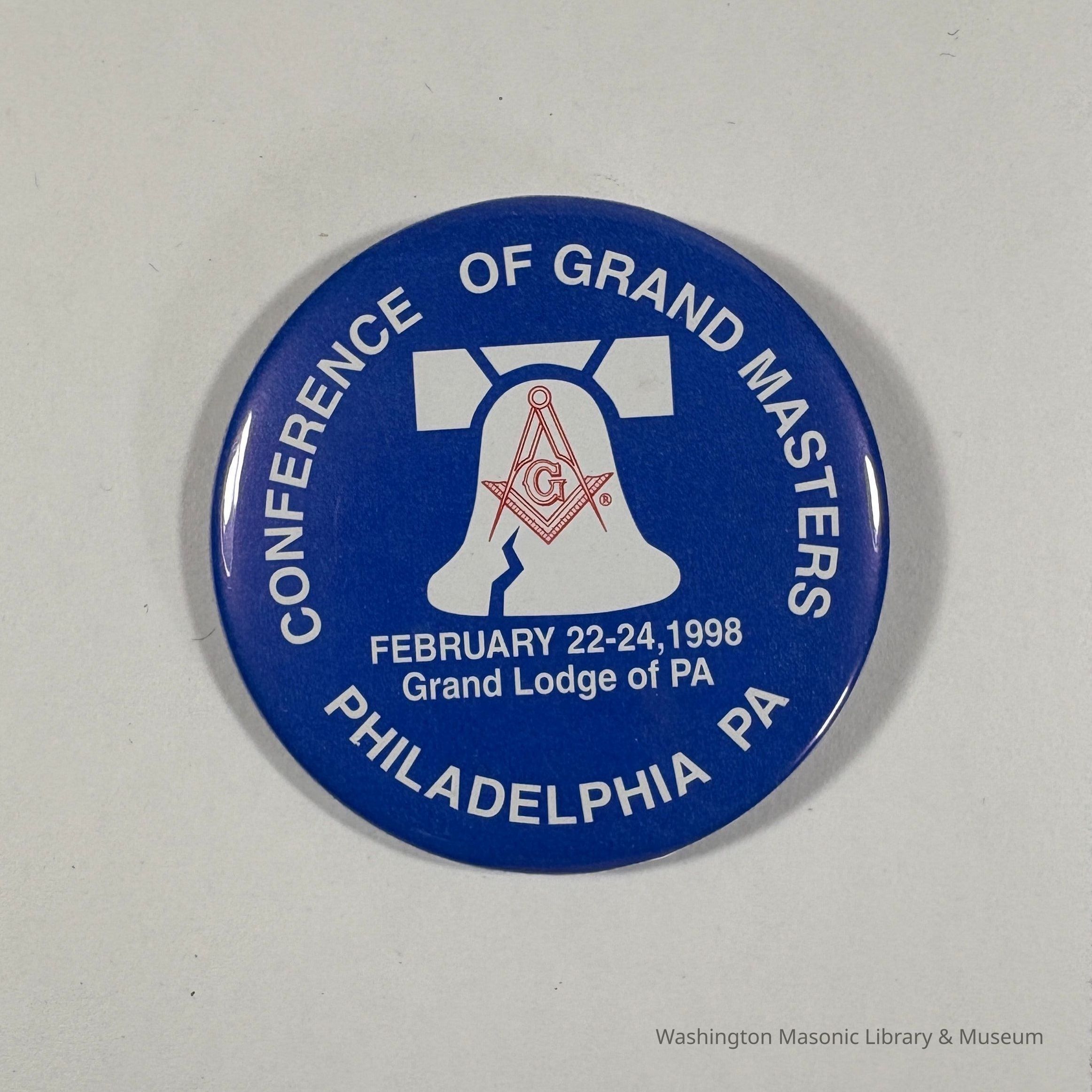 Button: Blue with White and red print. Liberty bell, Square and Compass. "Conference of Grand Masters/Philadelphia, PA/February 22-24, 1998/Grand Lodge of PA" (1998)Collection