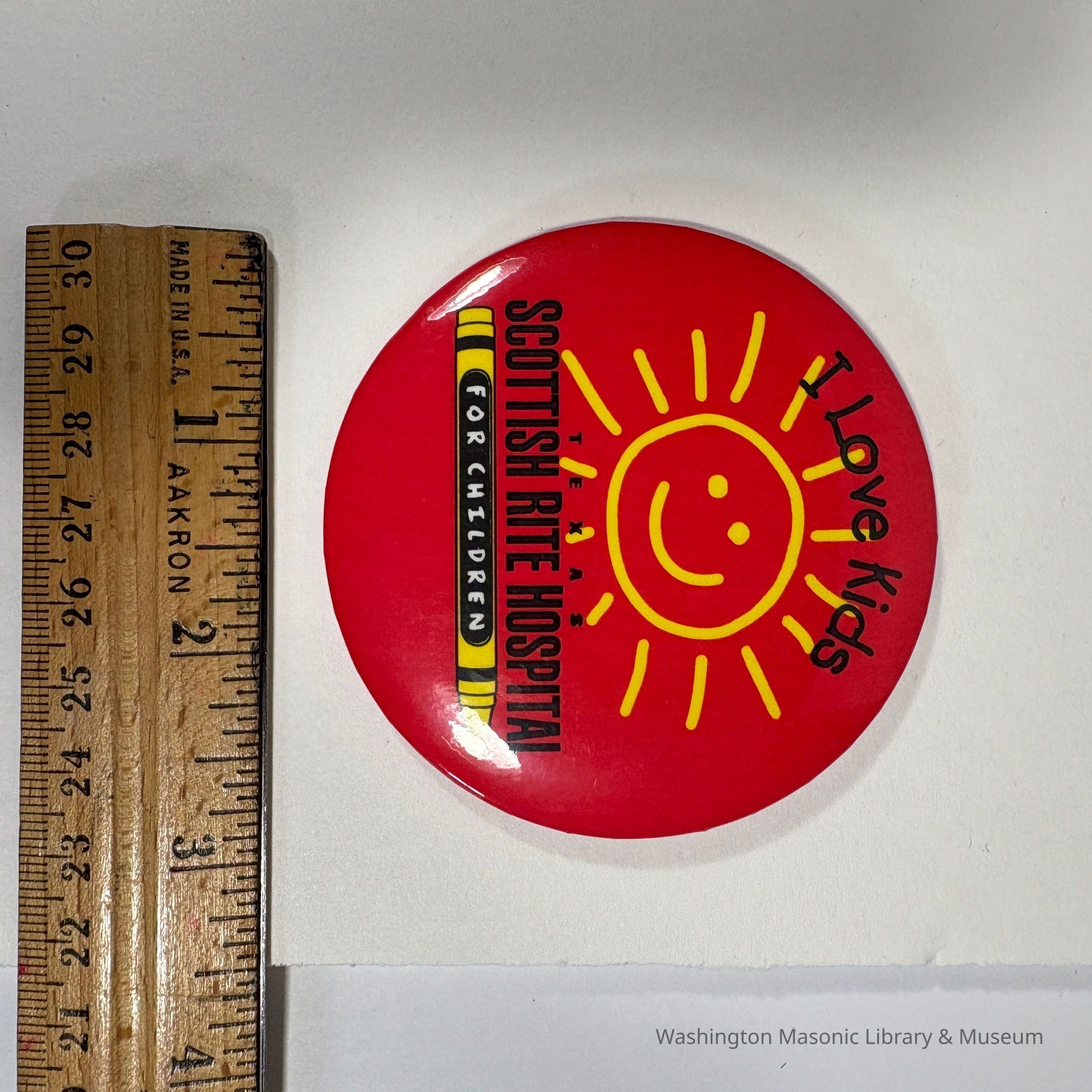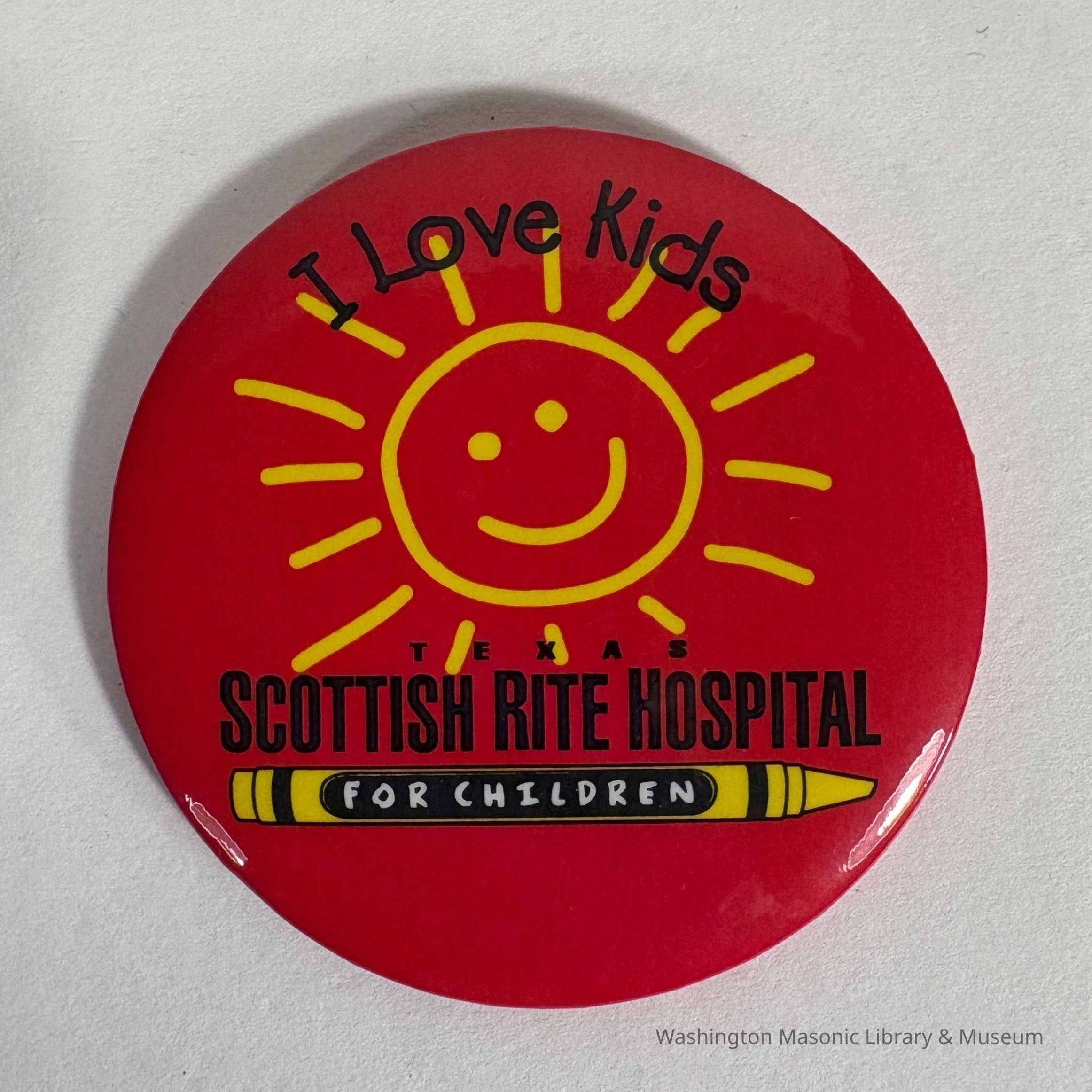 Button: Red with yellow and black print. Sun and crayon. "I Love Kids/Texas Scottish Rite Hospital For Children" (c. 1995)Collection