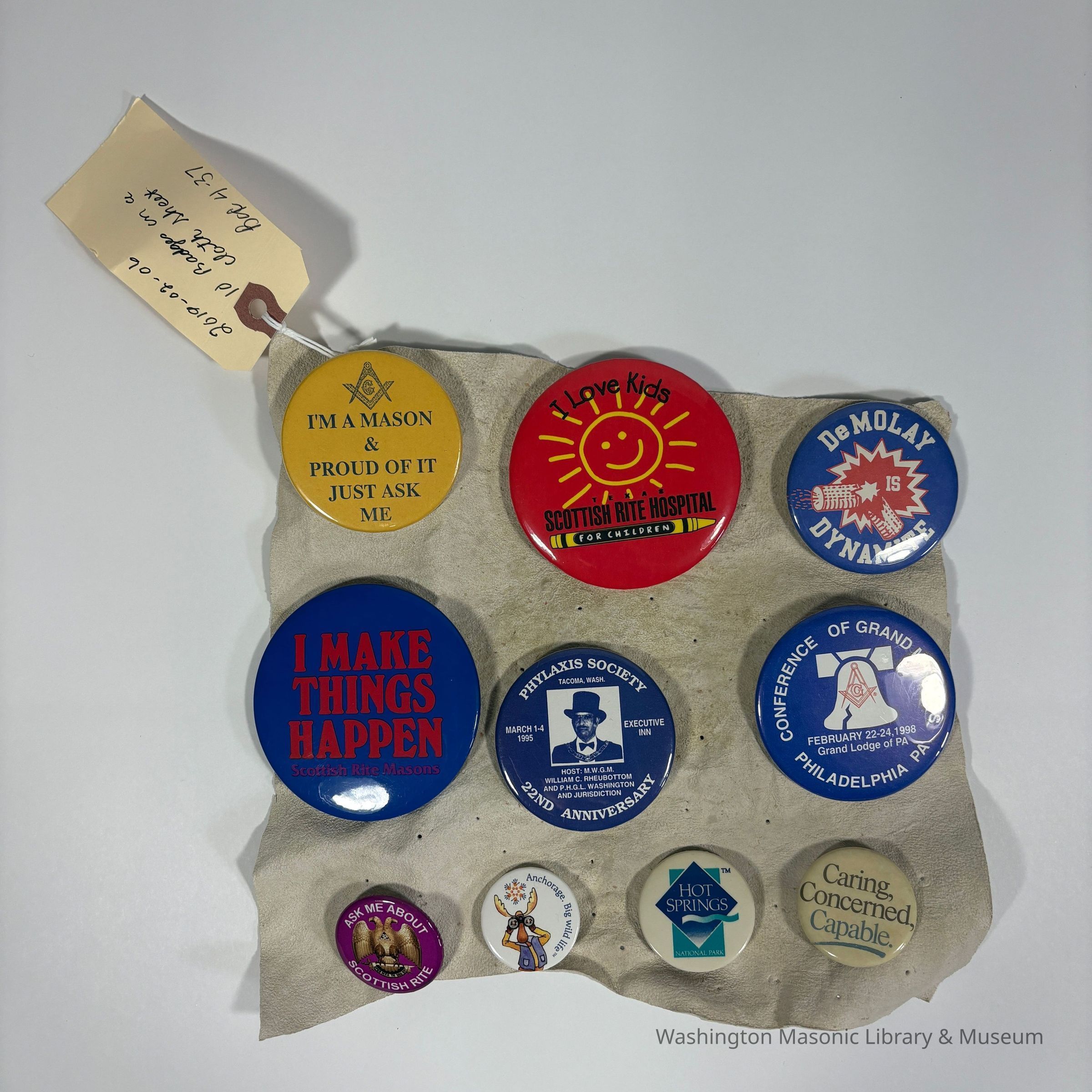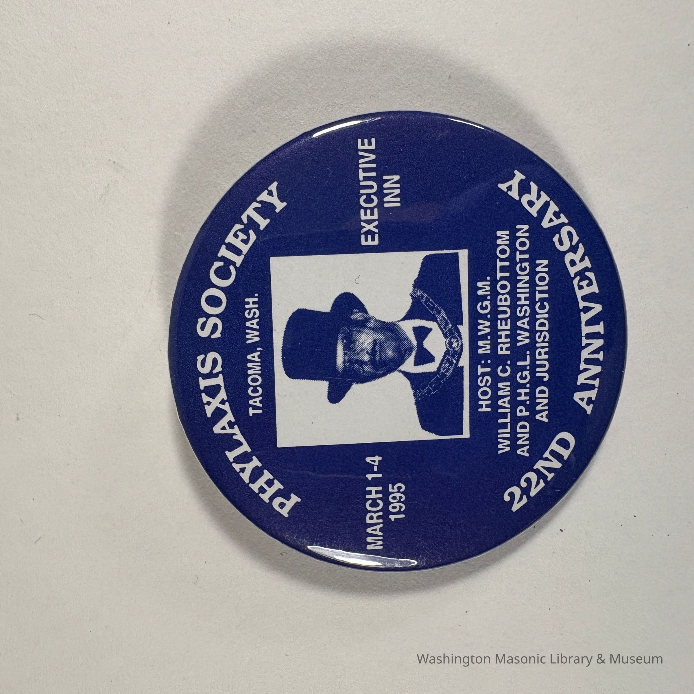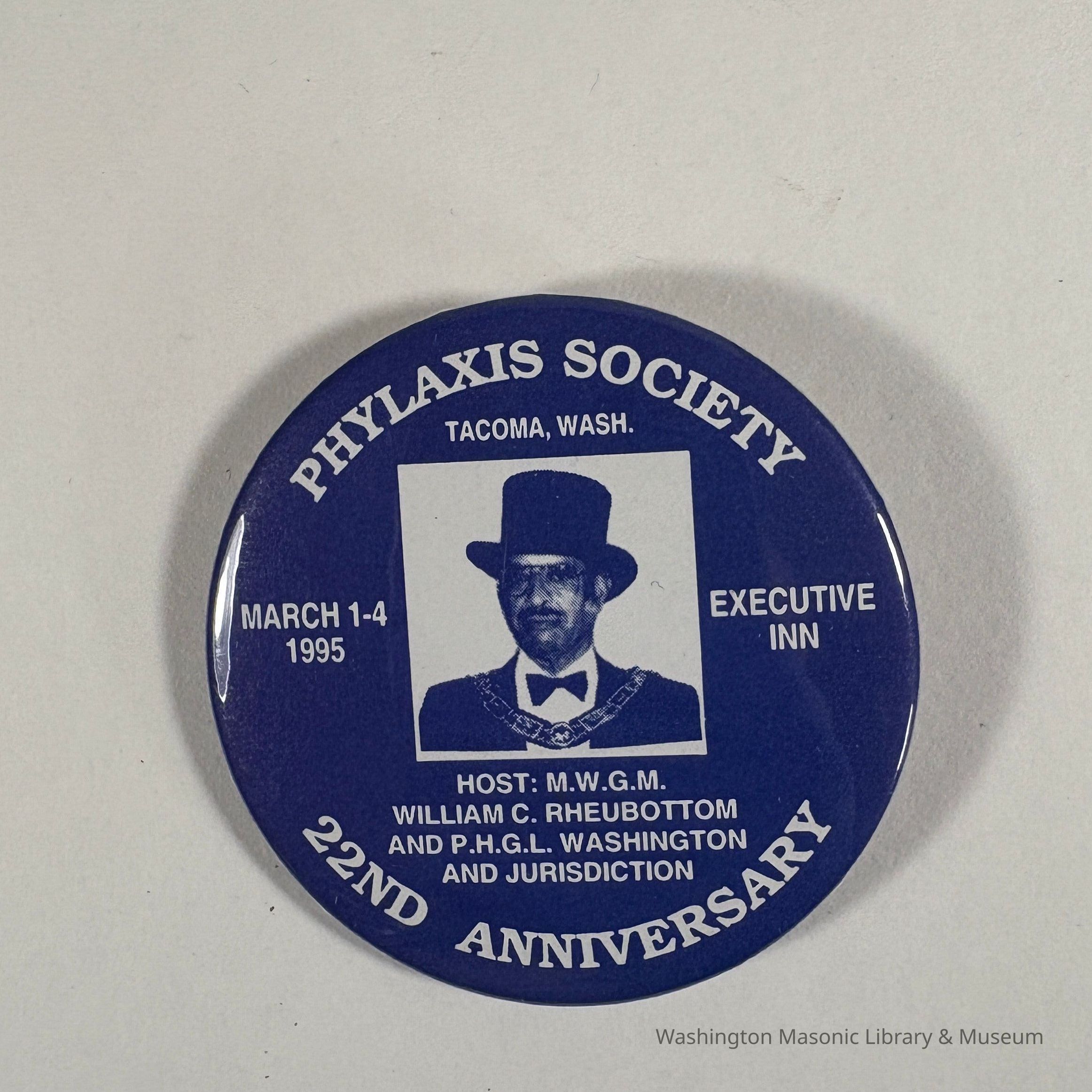 Button: Blue with White print. Man wearing top hat, bowtie, and Masonic collar. "Phylaxis Society 22nd Anniversary/ Tacoma, Wash March 1-4, 1995/Executive Inn/Host: M.W.G.M. William C. Rheubottom and P.H.G.L. Washington and Jurisdiction" (1995)Collection
