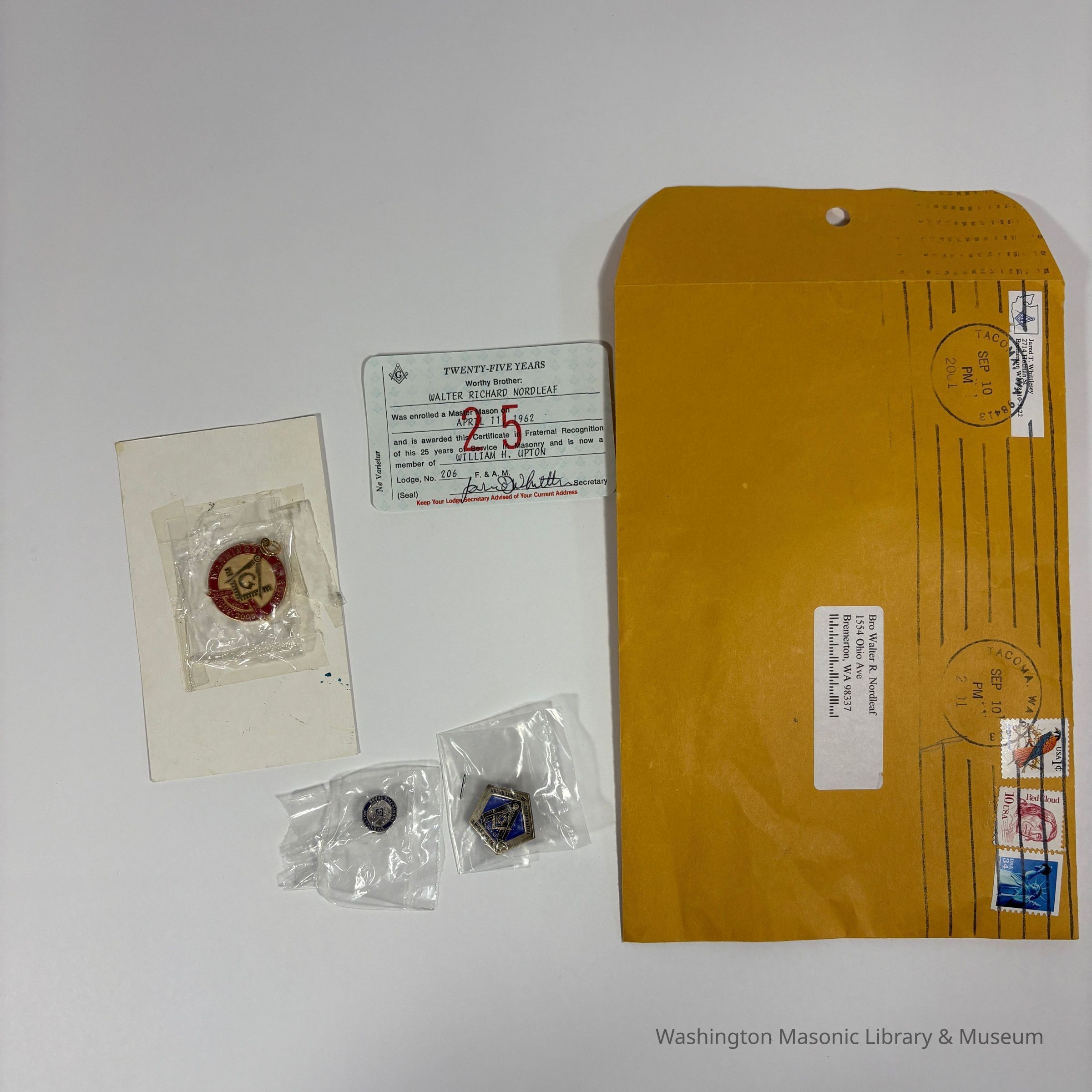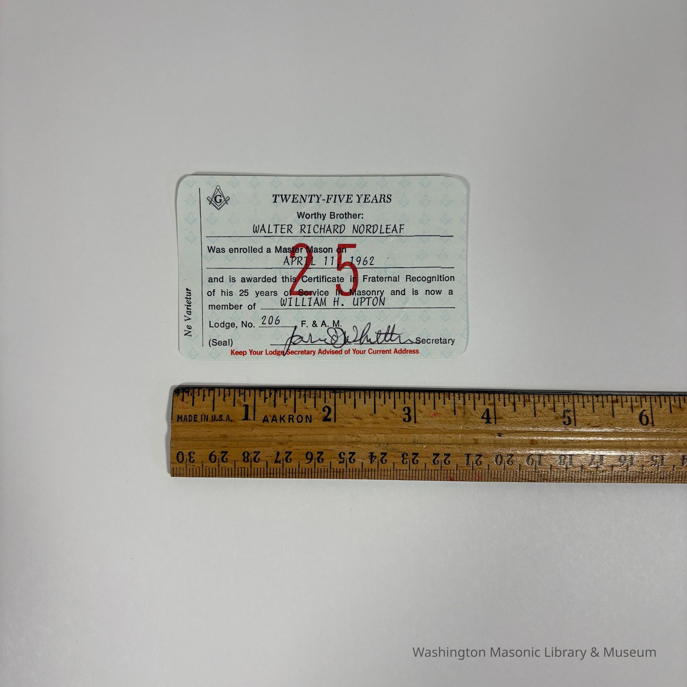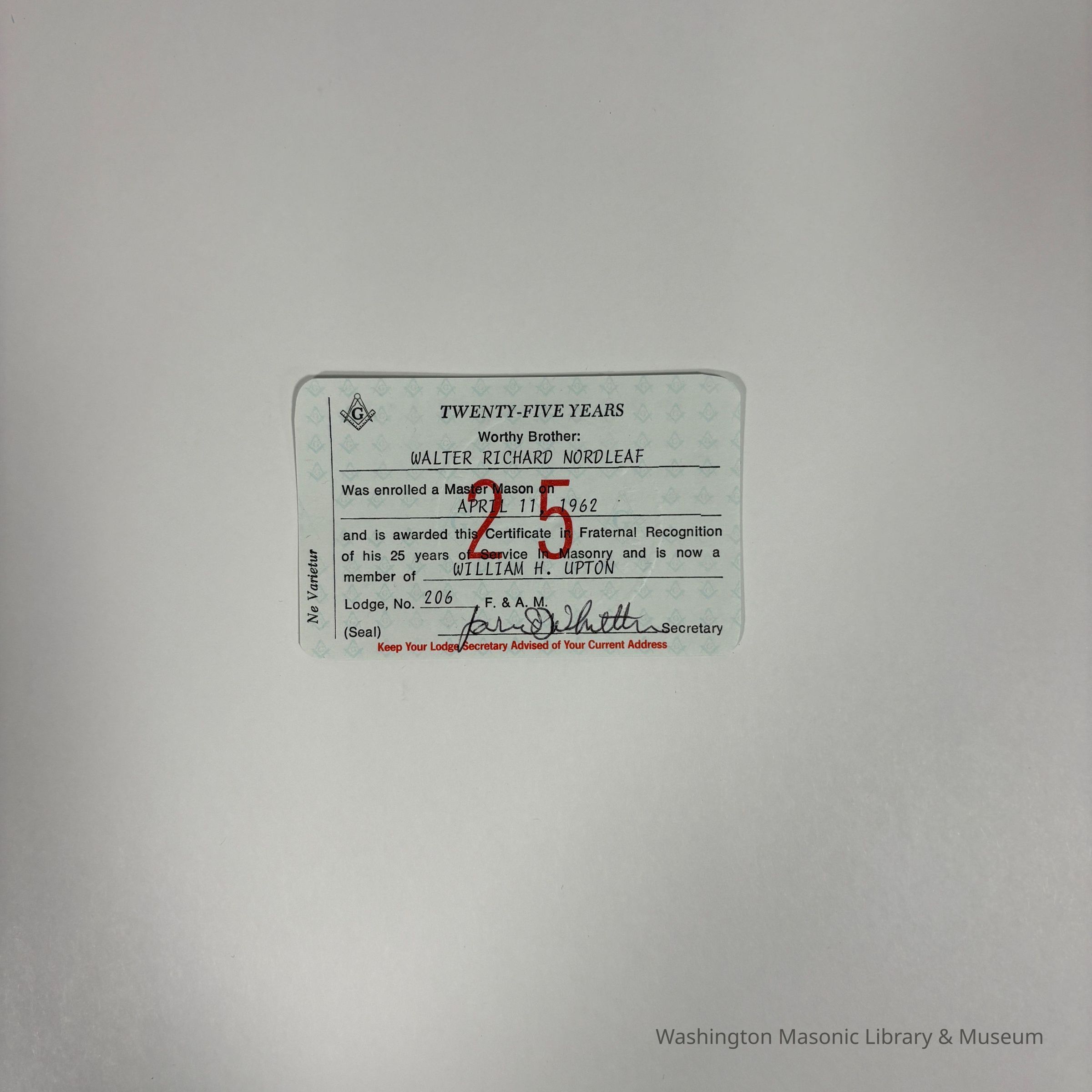 Card: Twenty-Five Year card. Certifying that Walter Richard Nordleaf was enrolled a Master Mason on April 11, 1962. Member of William H. Upton Loge No. 206. (1987)Made/Created