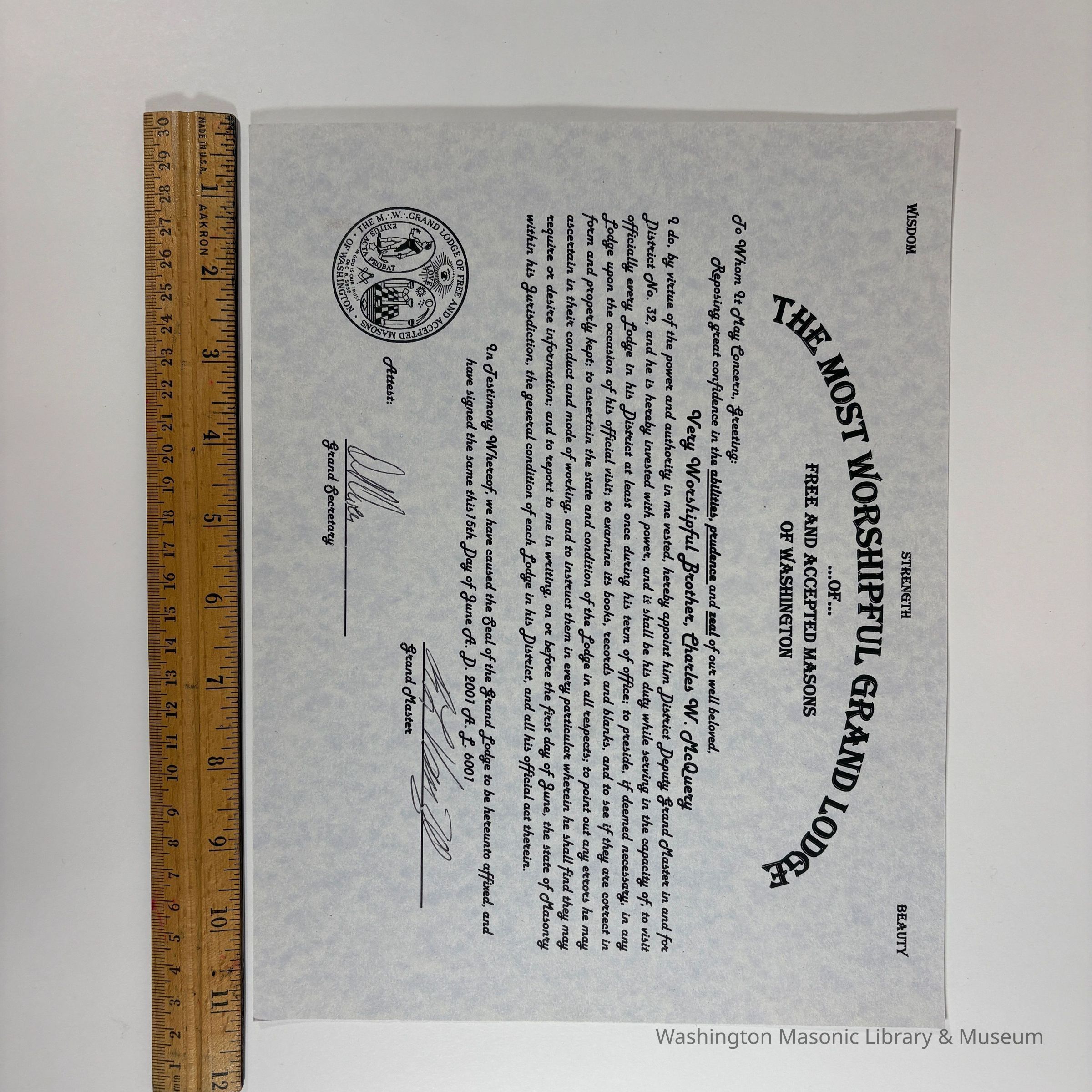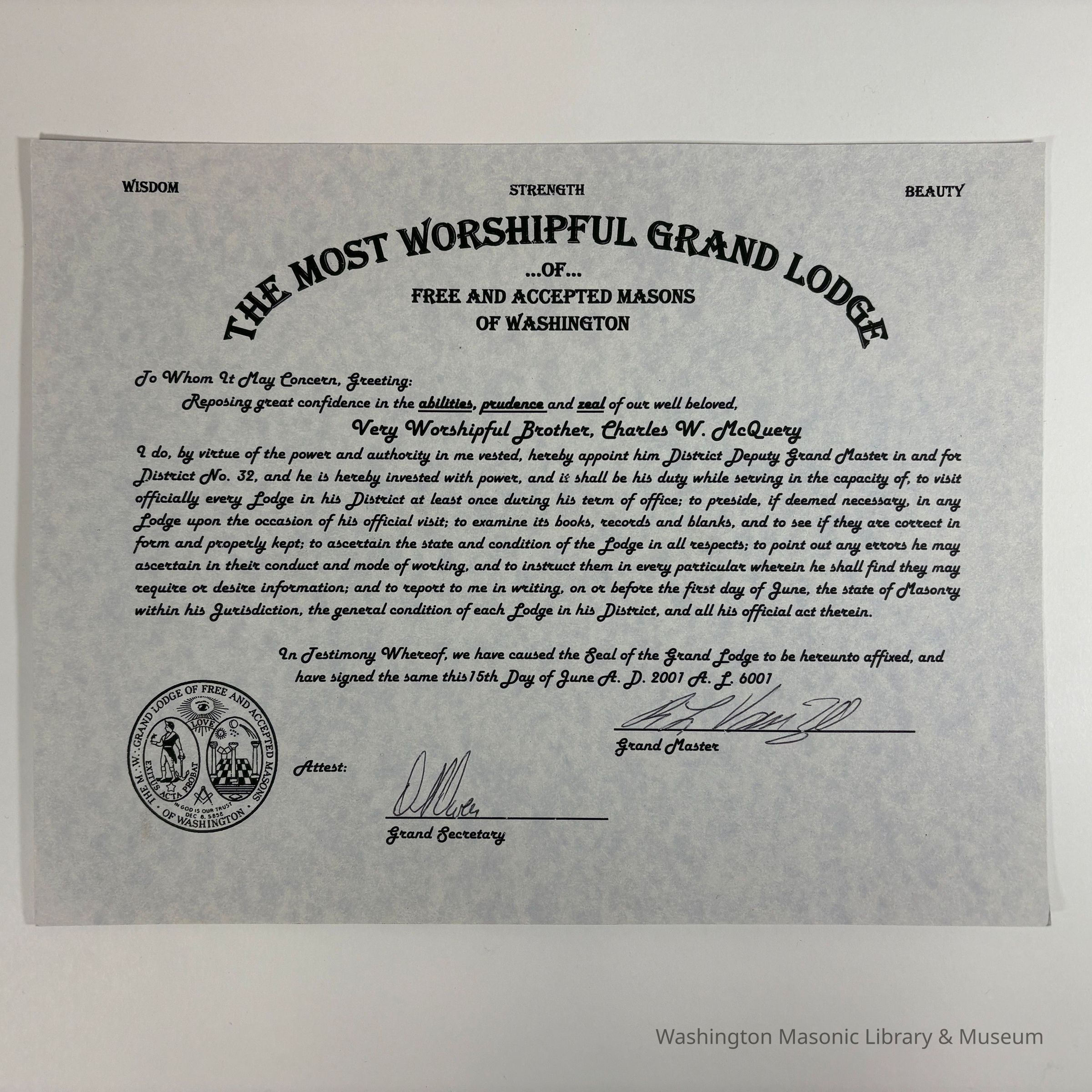 Certificate: Grey with black lettering. Deputy District Certificate issued to Charles W. McQuery for District No. 32 on June 15th, 2001. McQuery later was Grand Master of Washington (2006-2007). Signed by Grand Master Robert L. Van Zee and the Grand SecretaryCreate Date