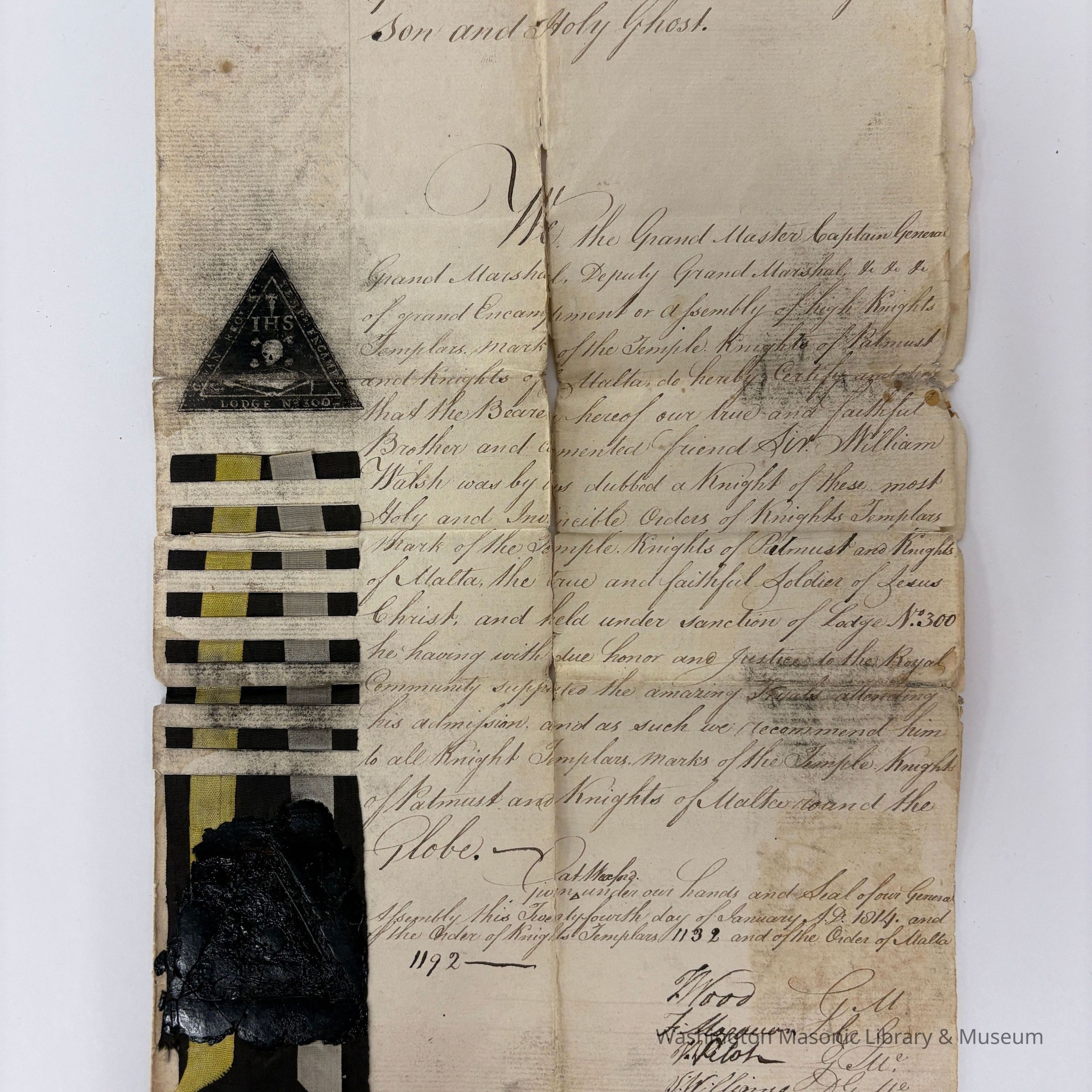Certificate: Knights Templar Knights of Patmos, Knights of Malta certificate issued to Sr. William Welsh (1814).Entry/Object ID