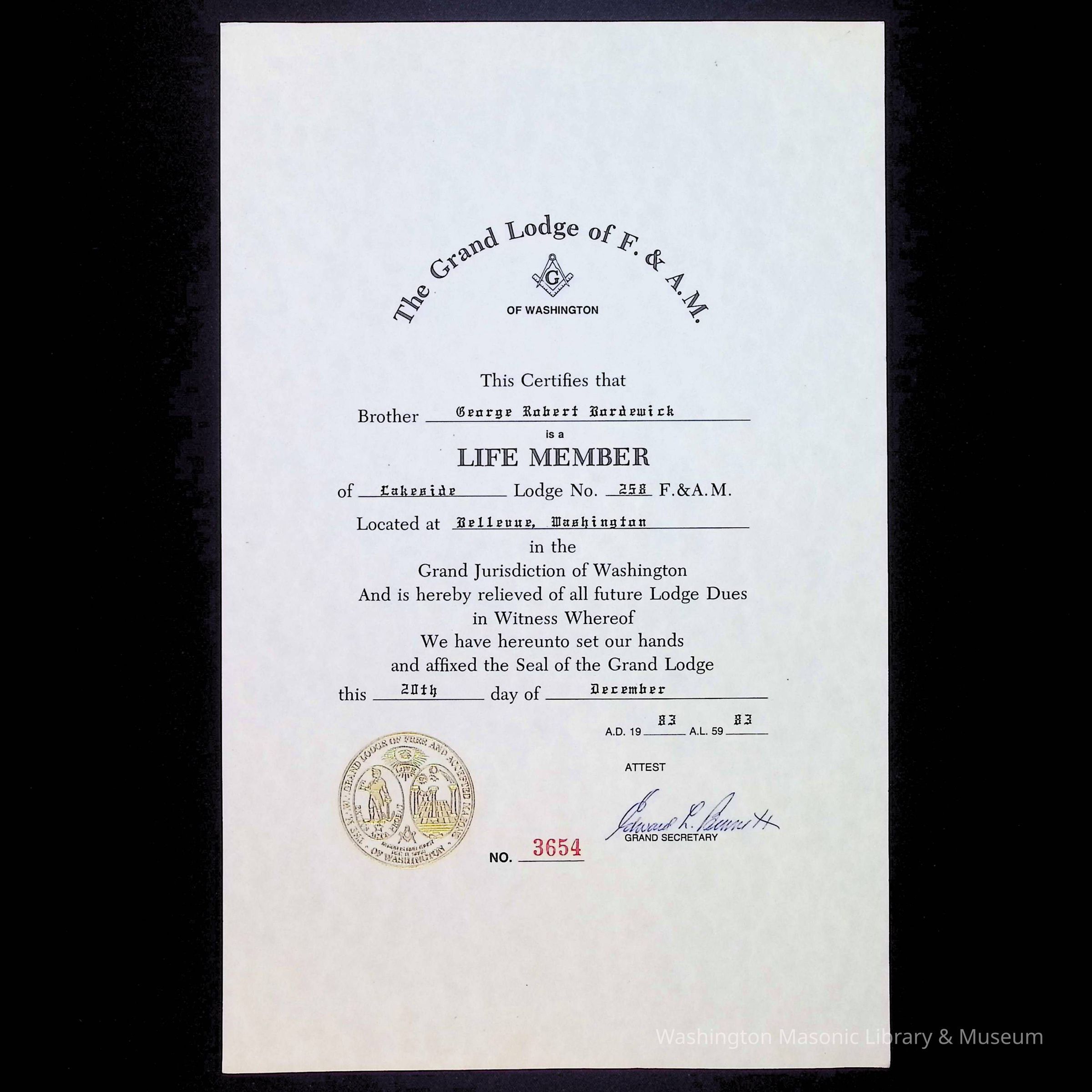 Certificate: Life Member Certificate awarded to George Robert Bordewick for Lakeside Lodge No. 258 (1983)Entry/Object ID