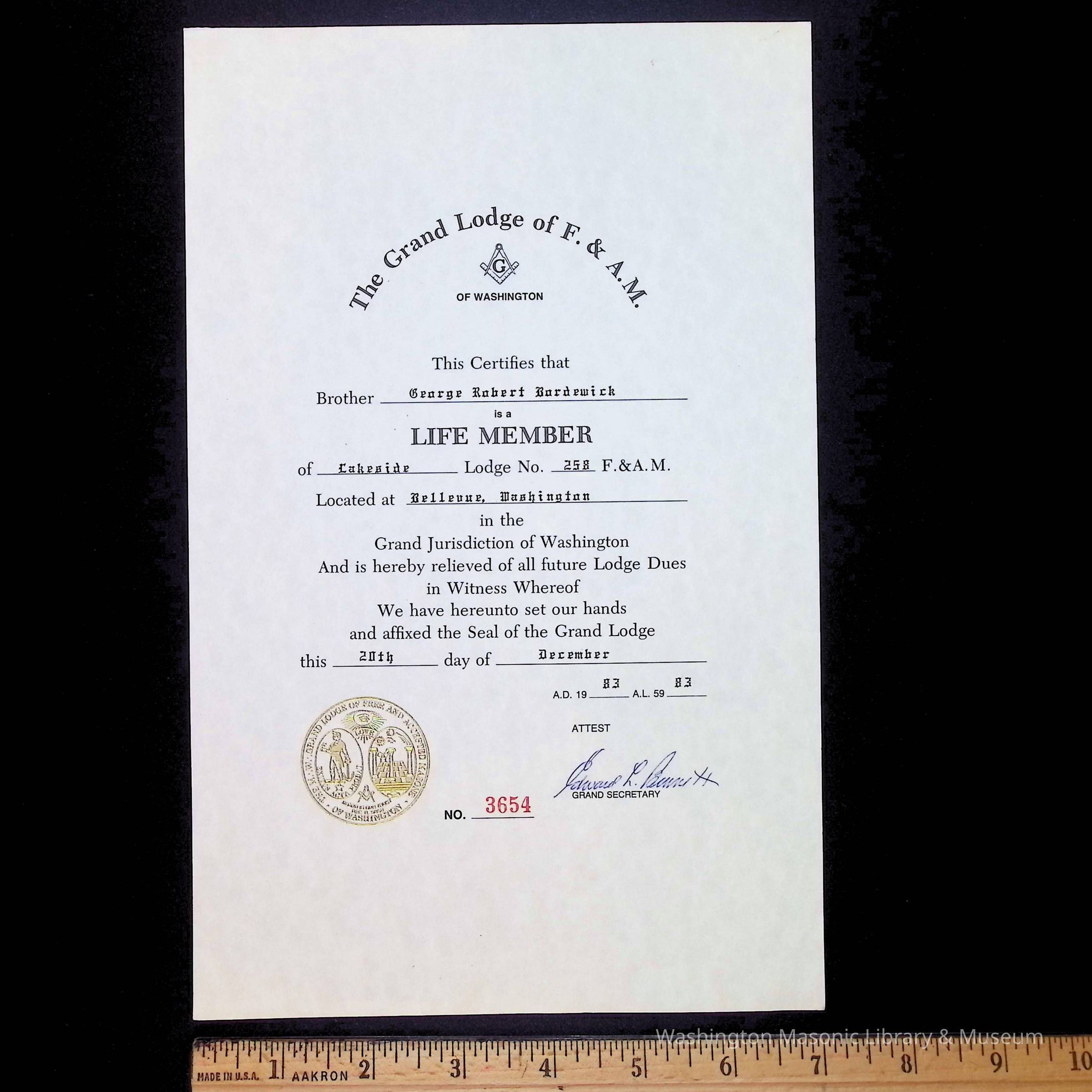 Certificate: Life Member Certificate awarded to George Robert Bordewick for Lakeside Lodge No. 258 (December 20, 1983)
