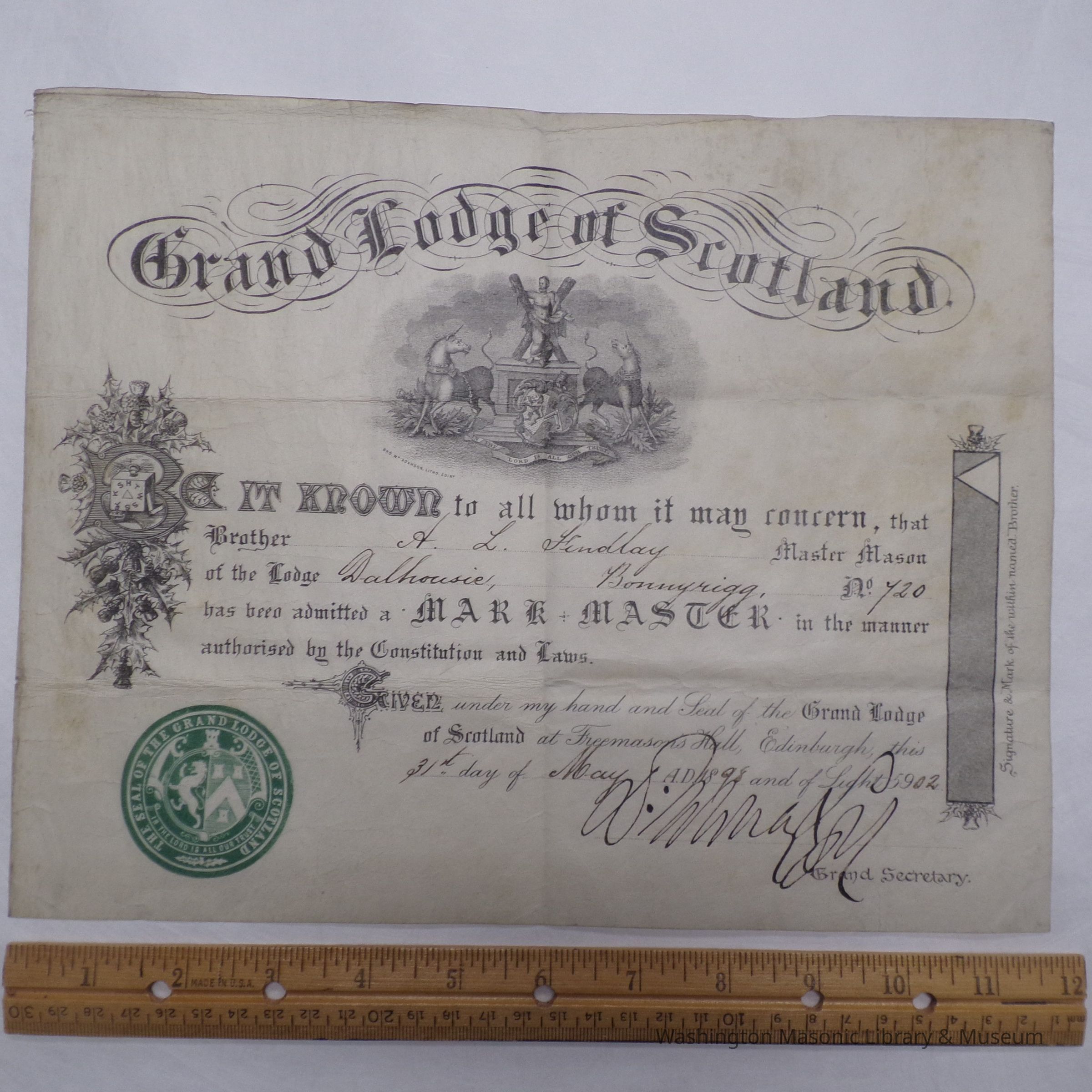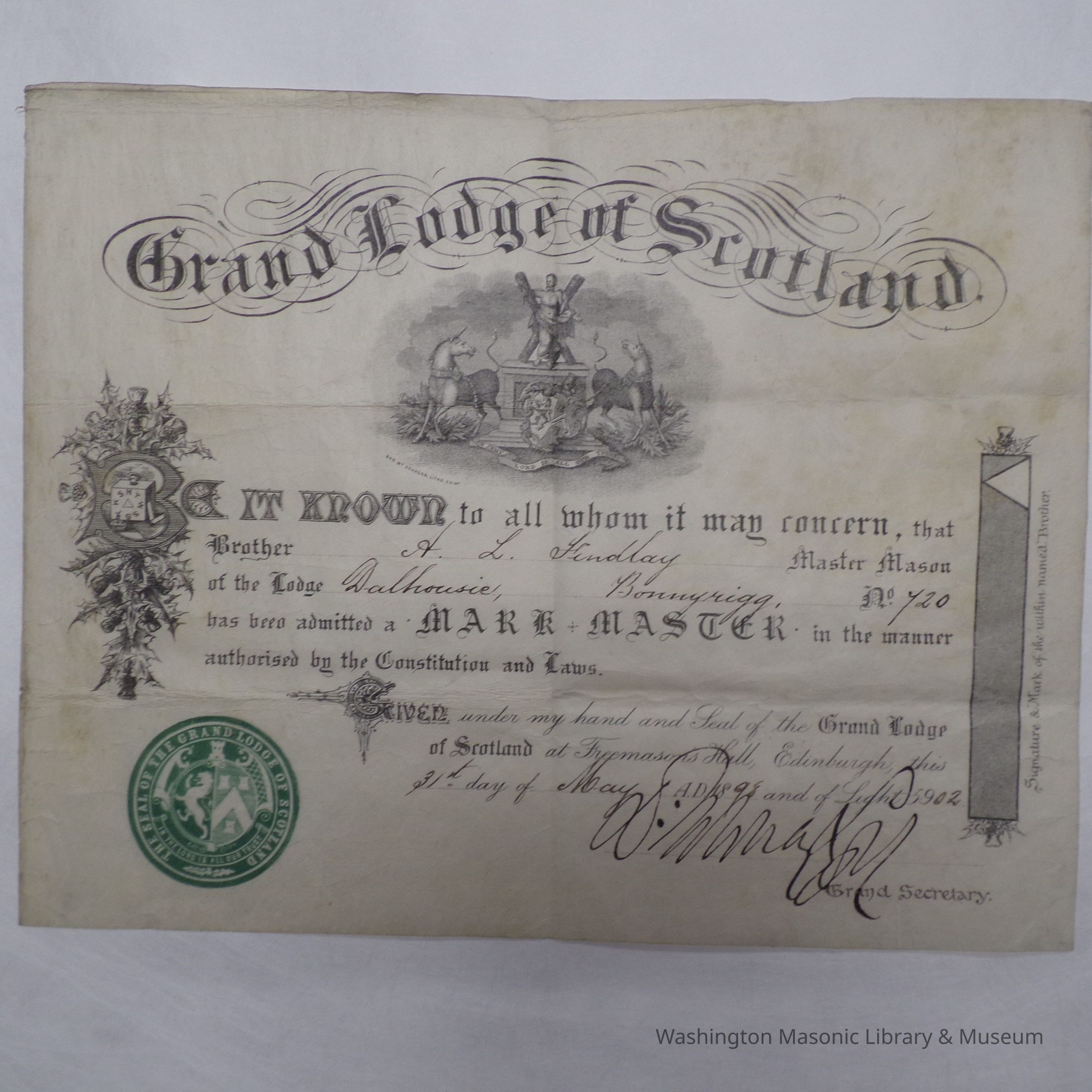 Certificate: Mark Master Certificate for A.L. Findlay of Dolhousie Lodge No. 720 (Bonnyrigg, Scotland) (1902)Entry/Object ID
