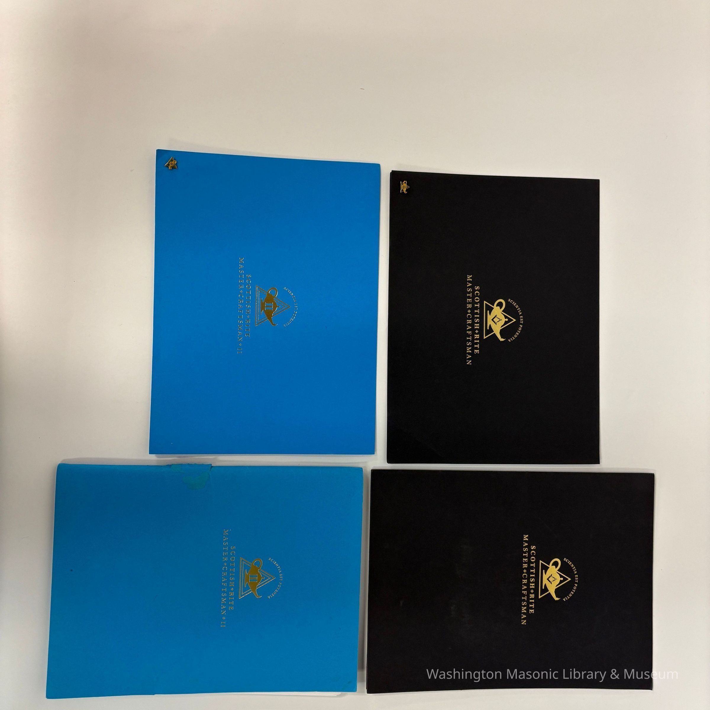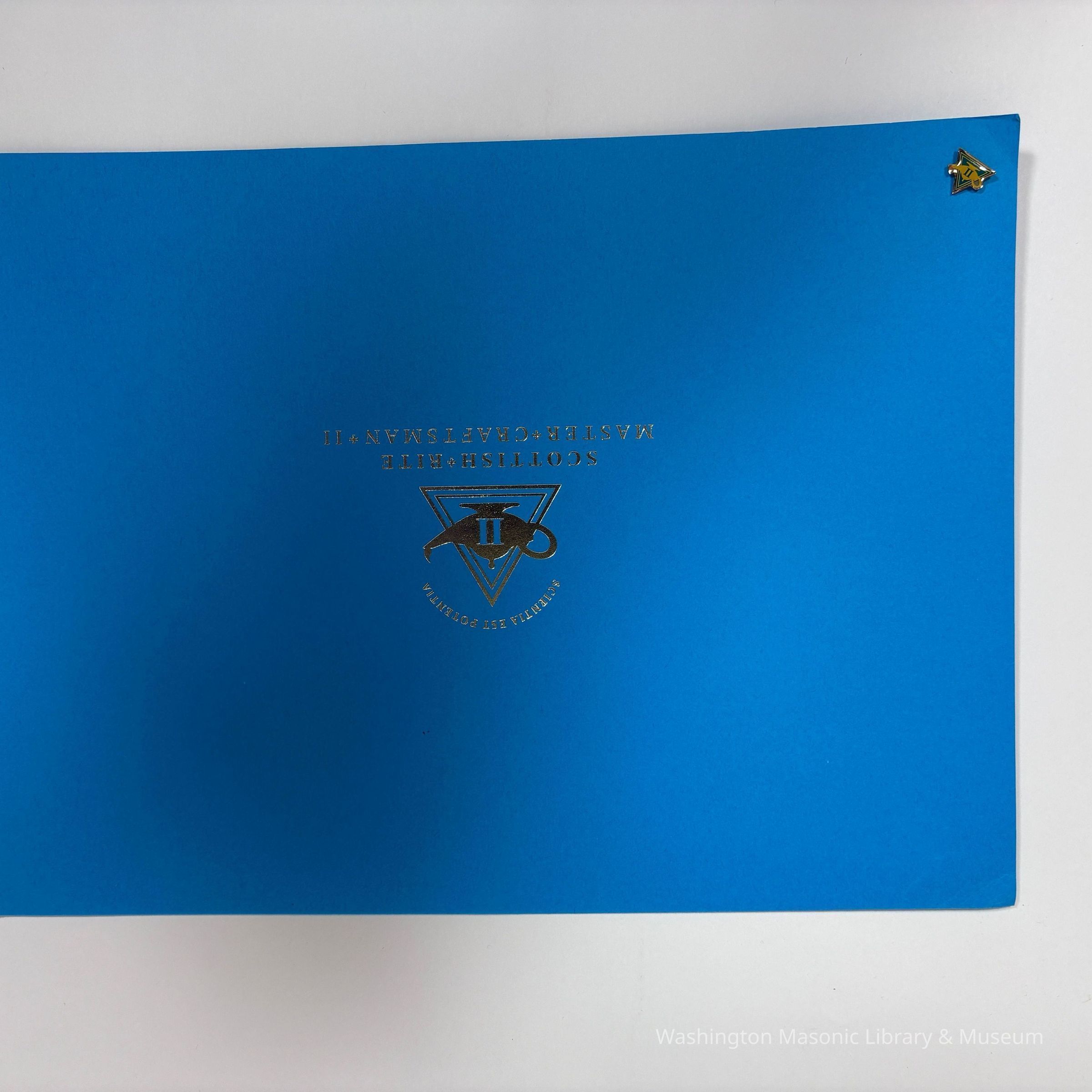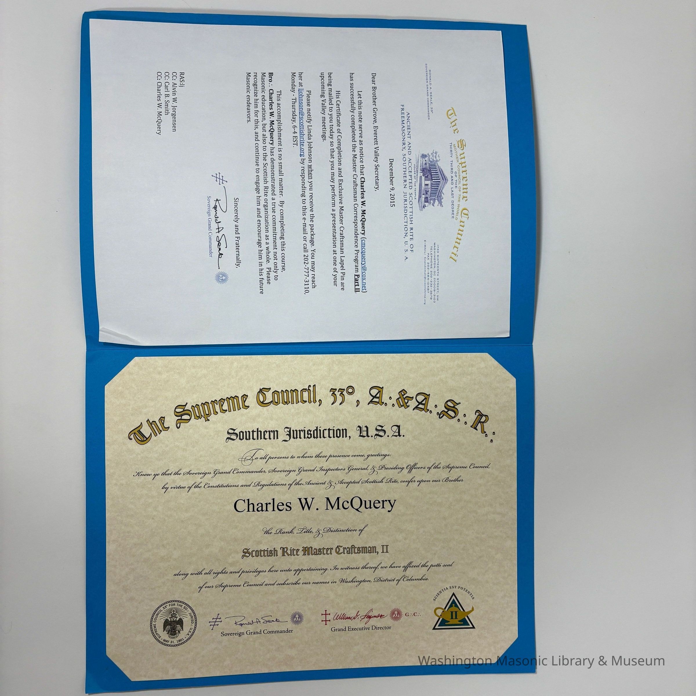 Certificate: In blue folder. Contains Scottish Rite Master Craftsman II Certificate earned by PGM Charles W. McQuery. McQuery started the program in 2009 and finished in 2015. Certificate and pin were mailed after completion.