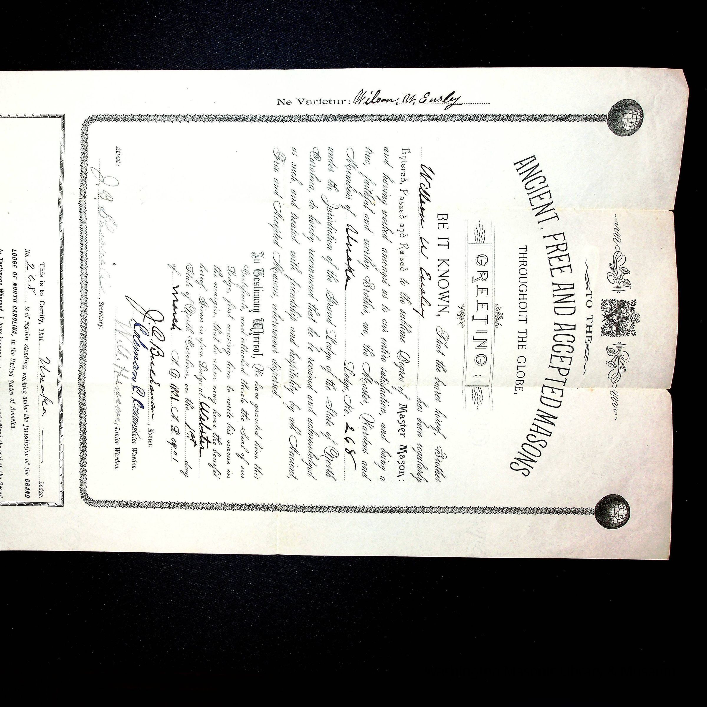 Certificate: William W. Eusleyds, Master Mason, Unaka Lodge No.268, Grand Lodge of North, Carolina, March 5, 1901Entry/Object ID
