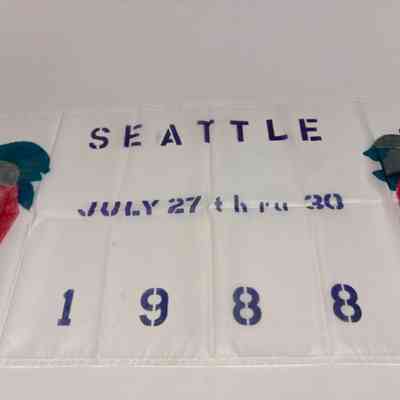 Banner: Vinyl and pen. Hand drawn apples and stenciled letters. York Rite Sovereign College 31st General Assembly Program. Seattle, Washington (July 27-30, 1988)Collection