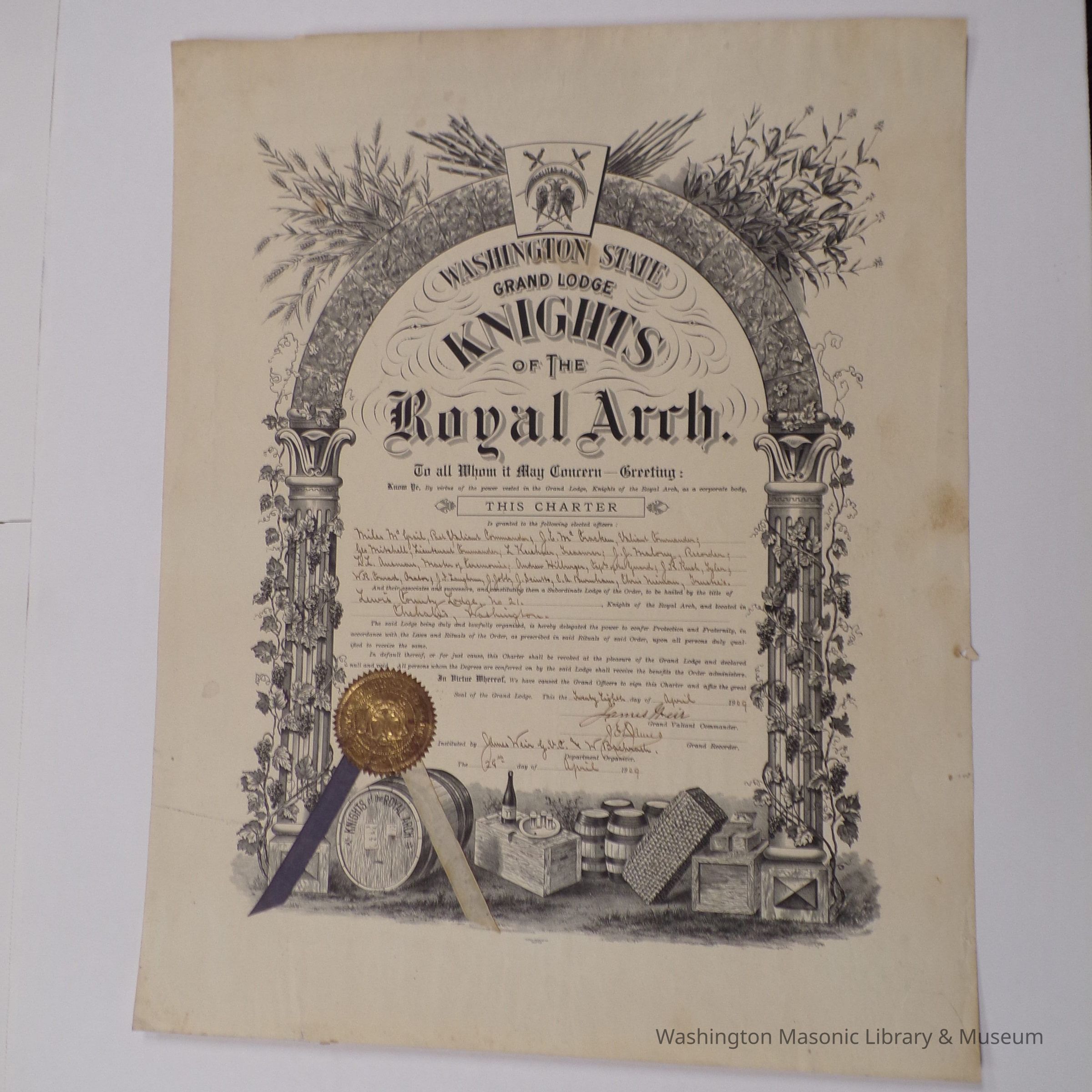 Charter: For WA State Grand Lodge Knights of the Royal Arch, April 28th, 1909. Signed by Grand Recorder J.E. Davies(sp?)Collection