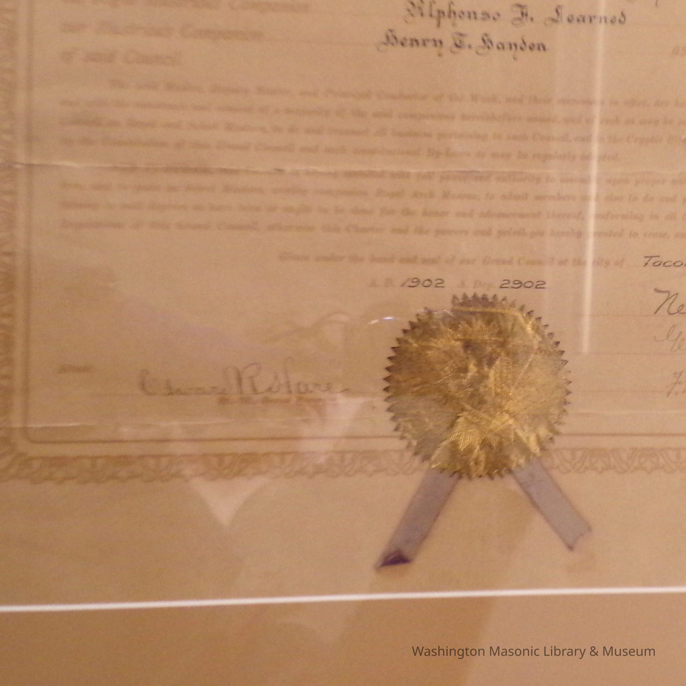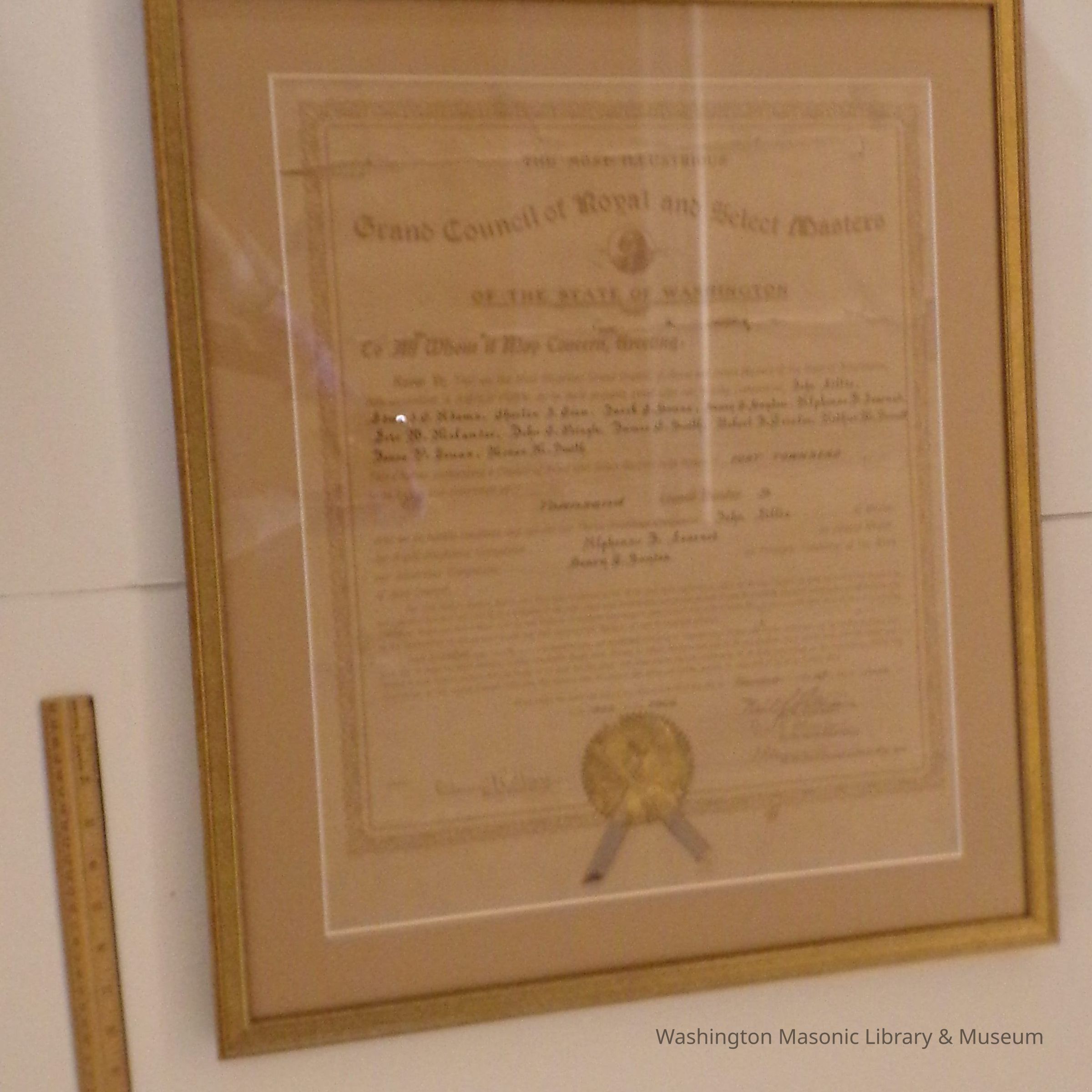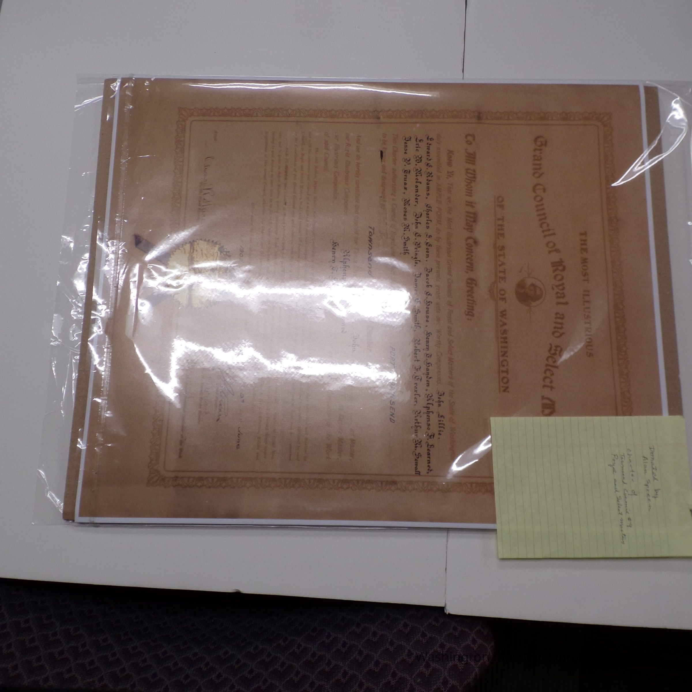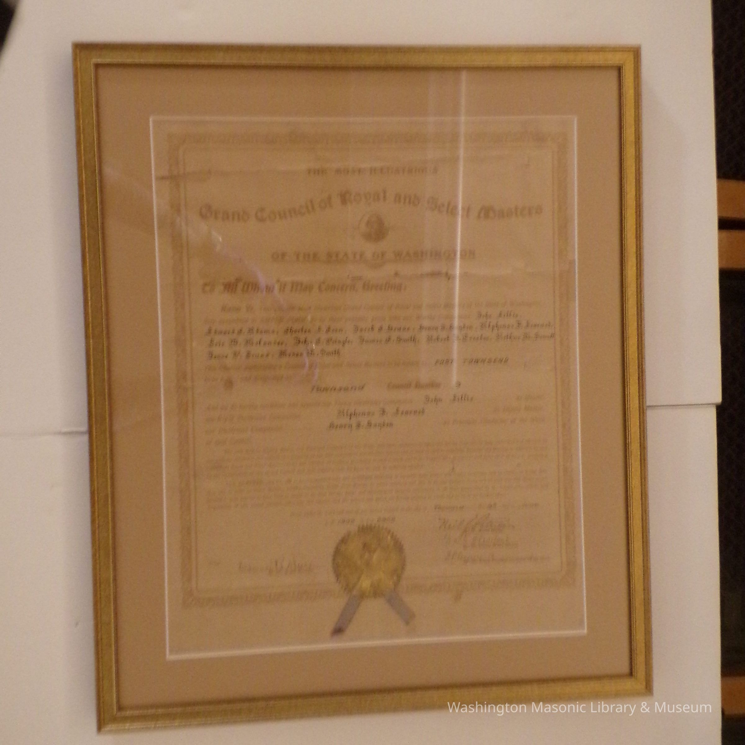 Charter: Framed. "Charter of Townsend Council #9 Royal and Select Masters." June 9, 1902. Donated by Alan Spreen. Poster reproduction accompanies original.Collection