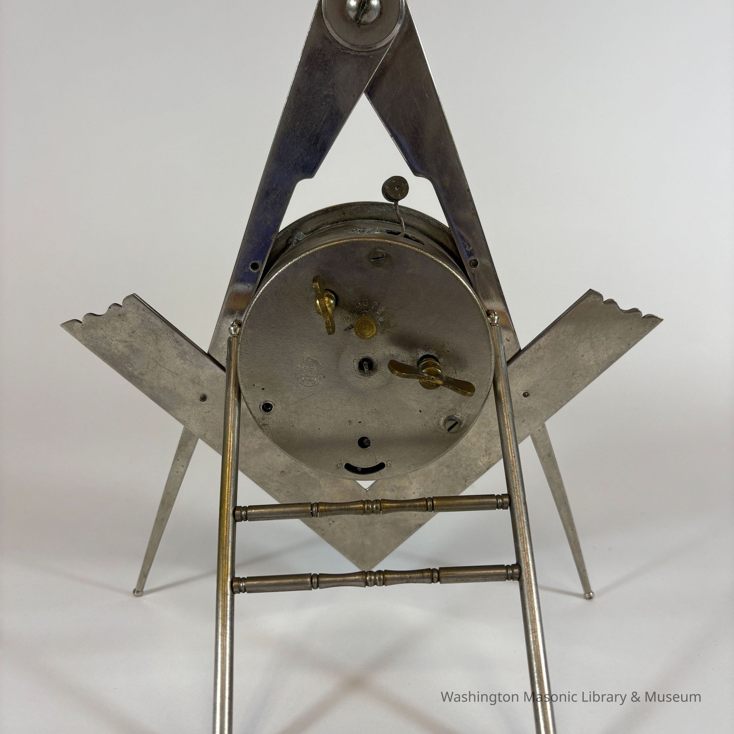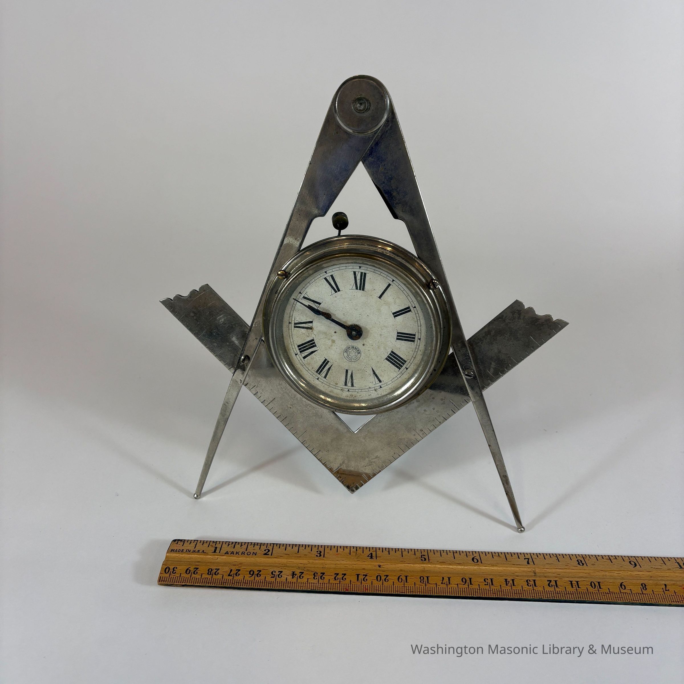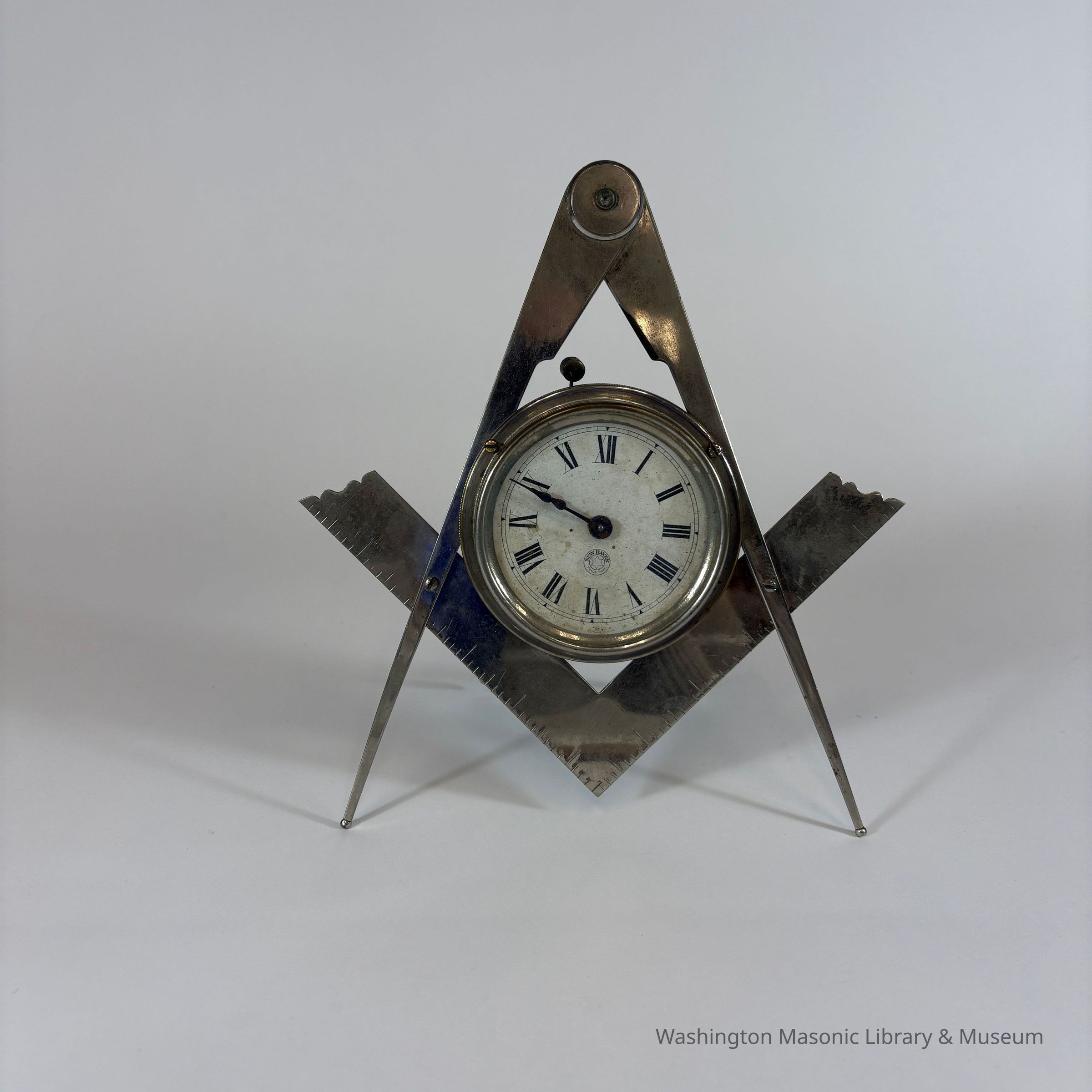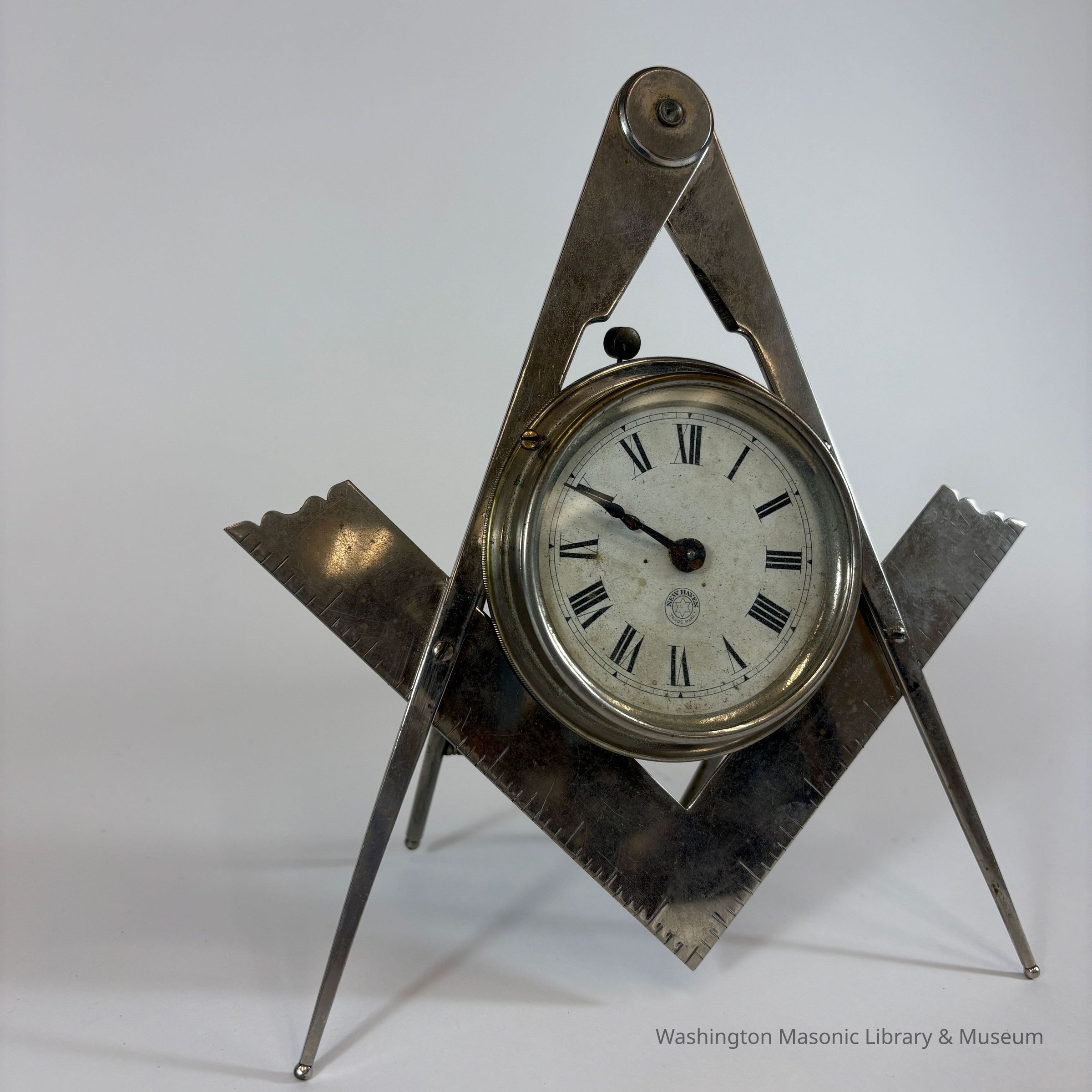 Clock: Silver Square and Compass clock. New Haven Clock Company. early 20th century.Entry/Object ID