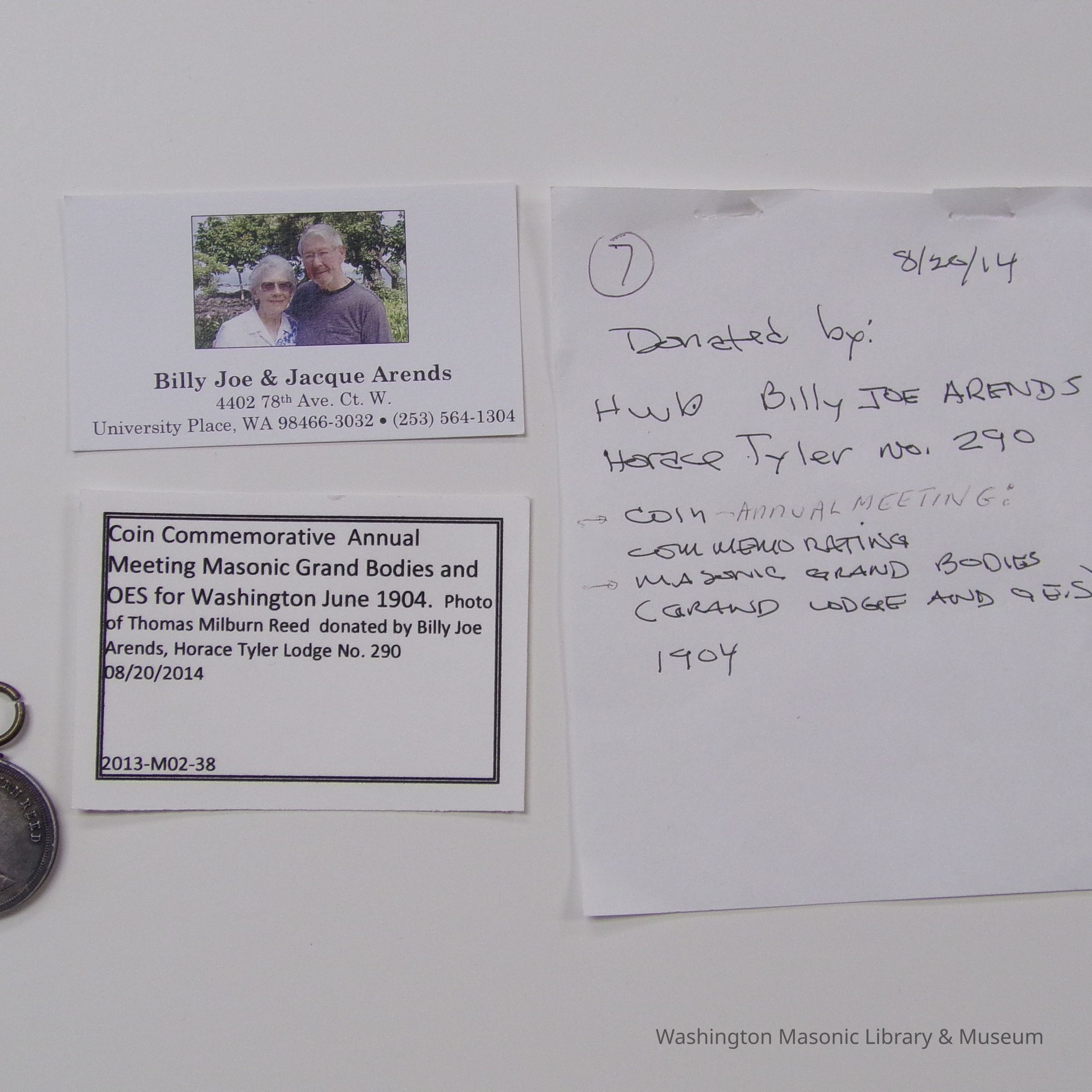 Coin: Commemorative Coin for Annual meeting Masonic Grand Bodies and OES for Washington, June 1904. Image of Thomas Milburn Reed.
