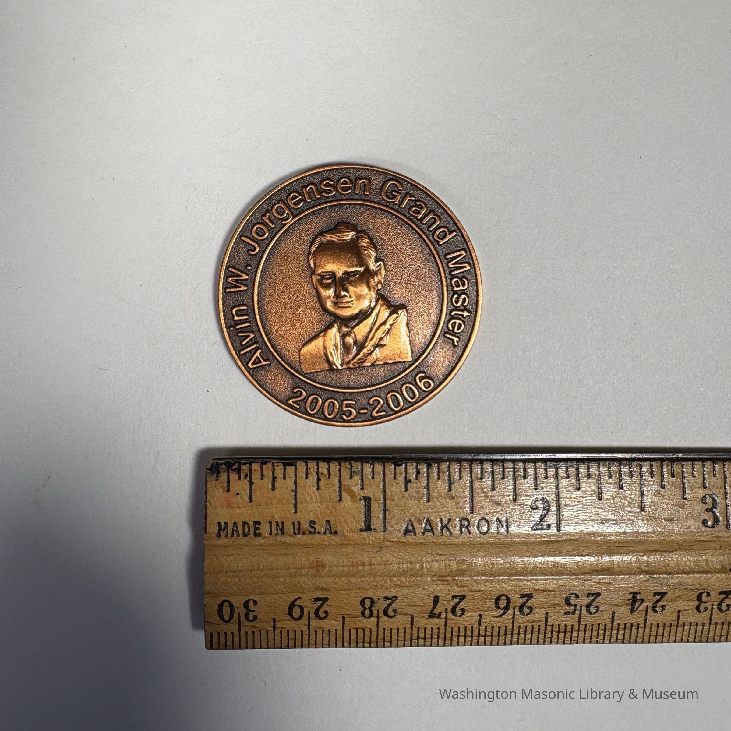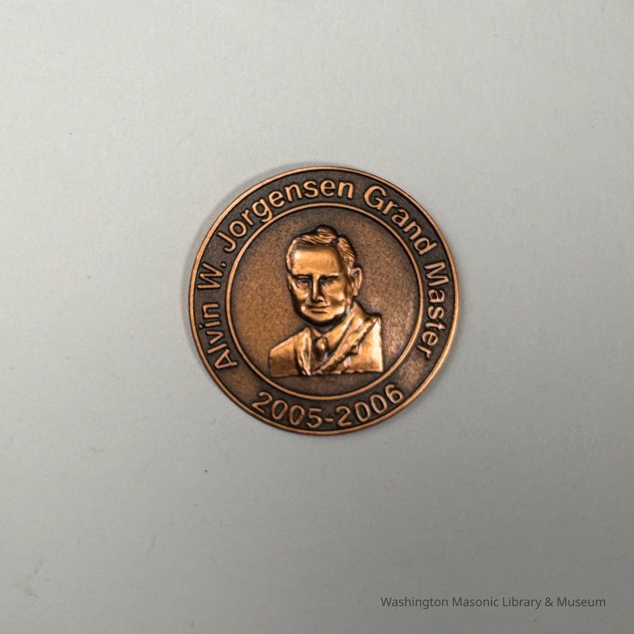 Coin: Copper. Past Grand Master Coin for MW Alvin W. Jorgensen (2005-2006). On the front is a bust of Jorgensen.